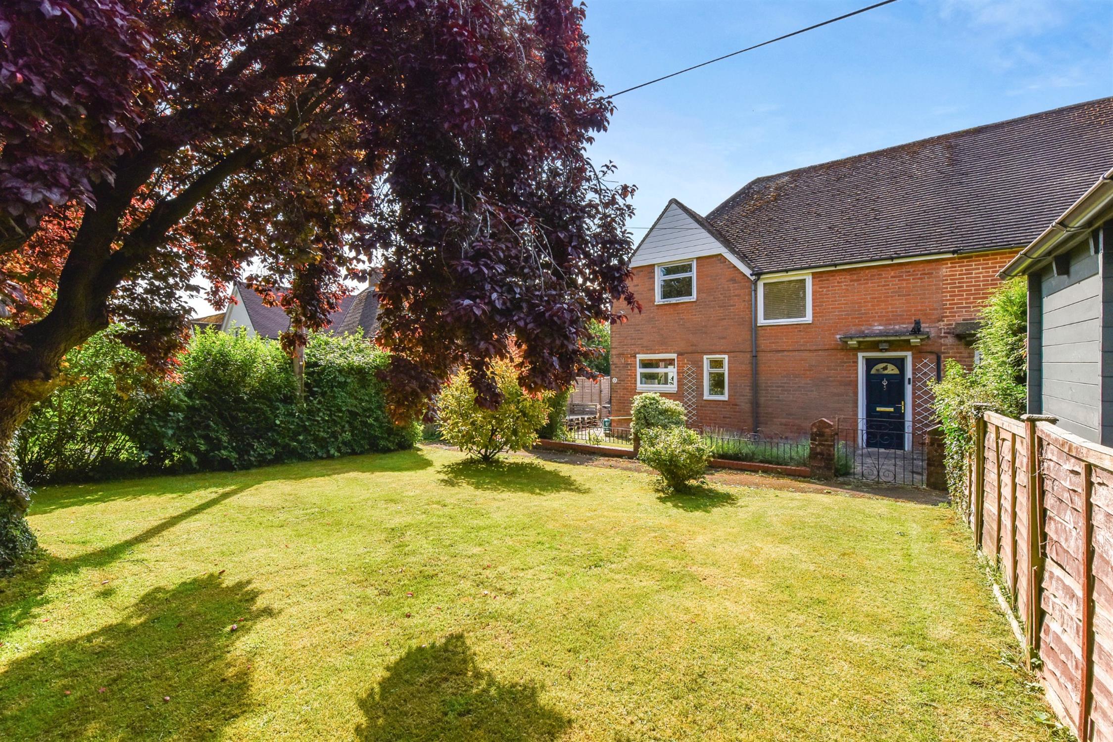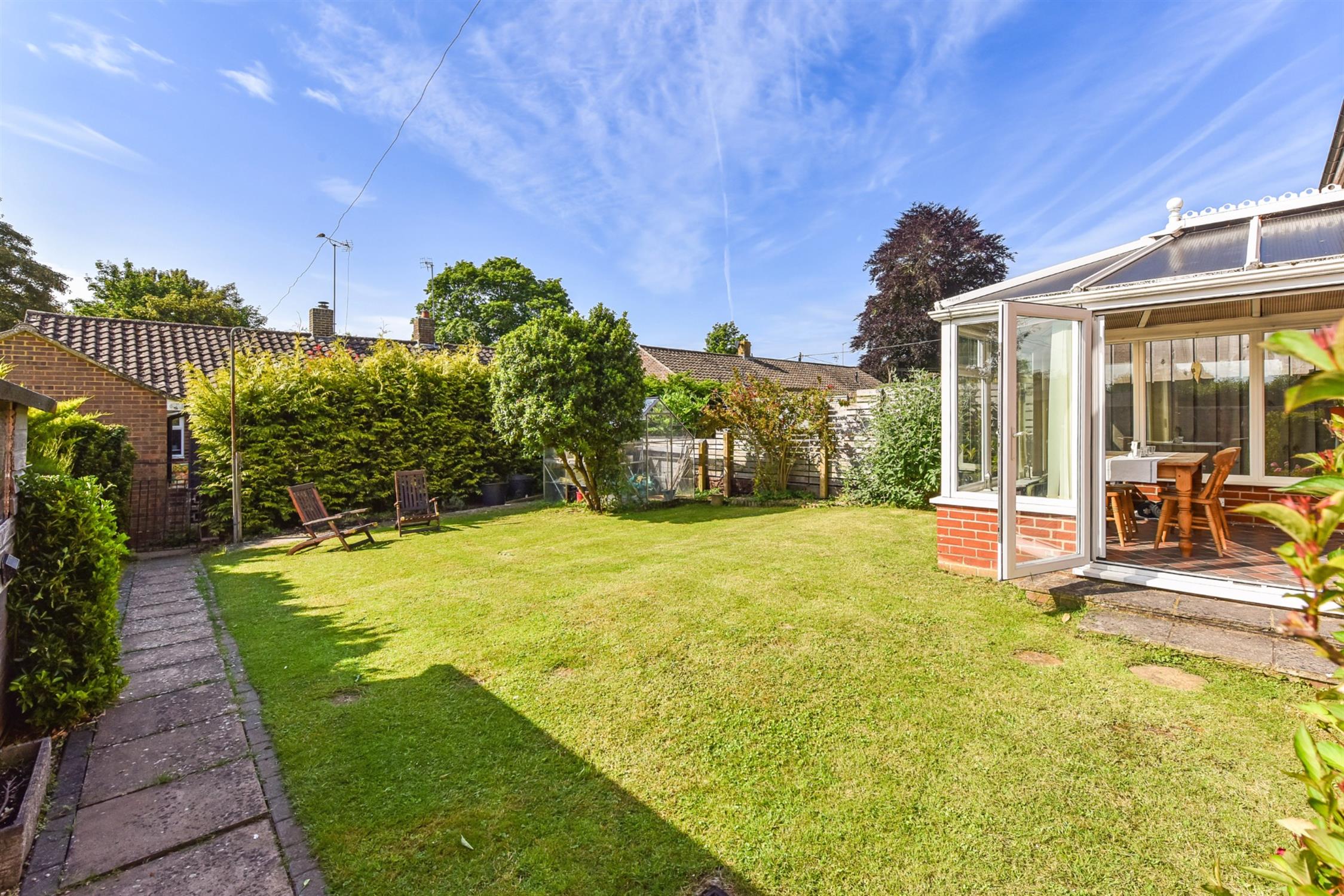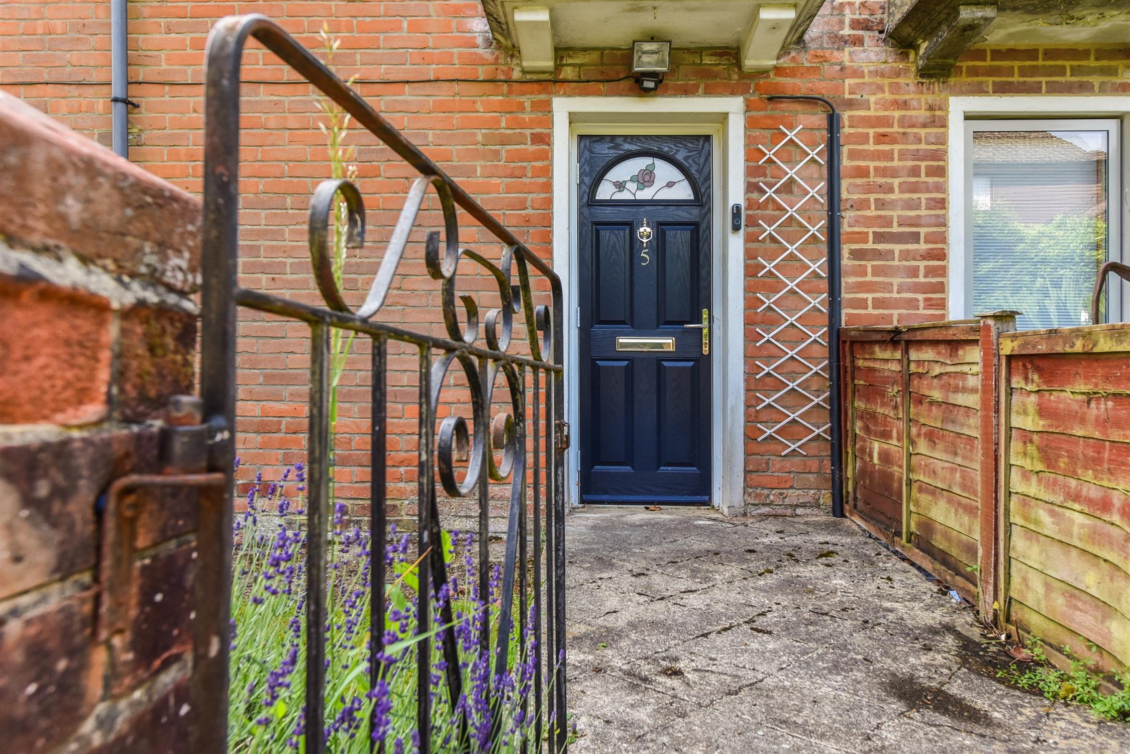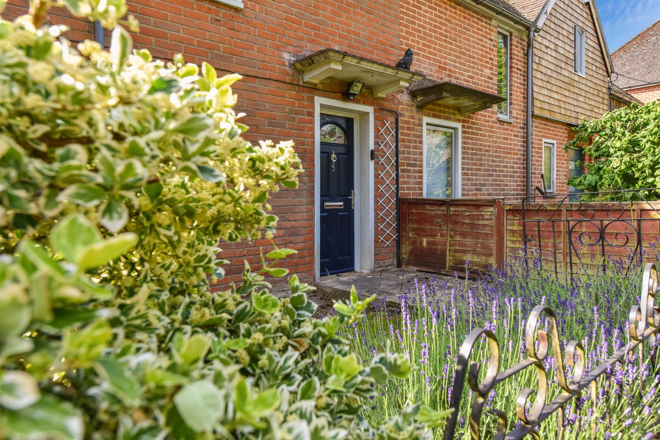 The property is set back from the road and can be approached via a pedestrian path to the front, or access from the rear. To the front of the property is a neat front garden with planted beds, lavender and lawn. Path to the front door.