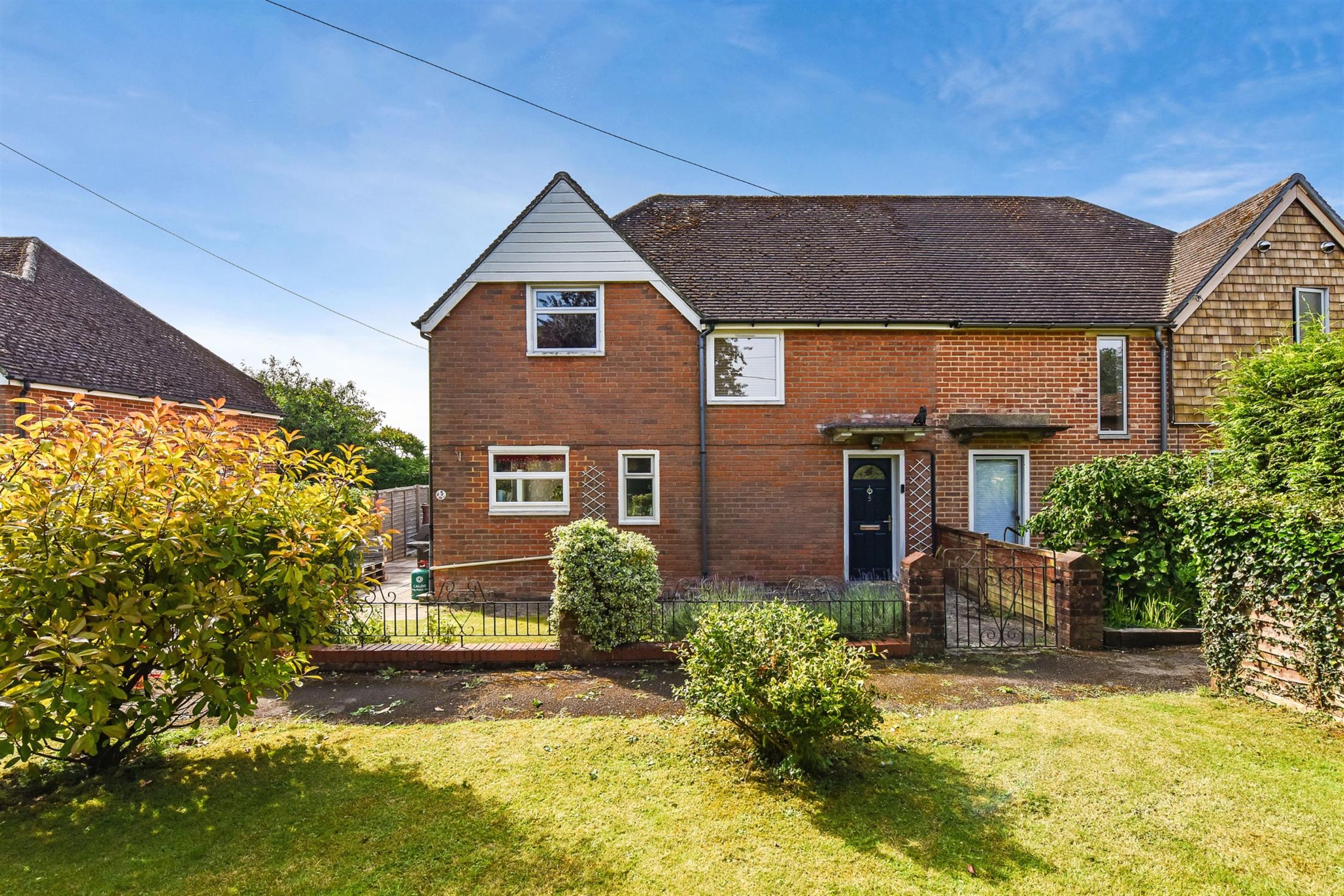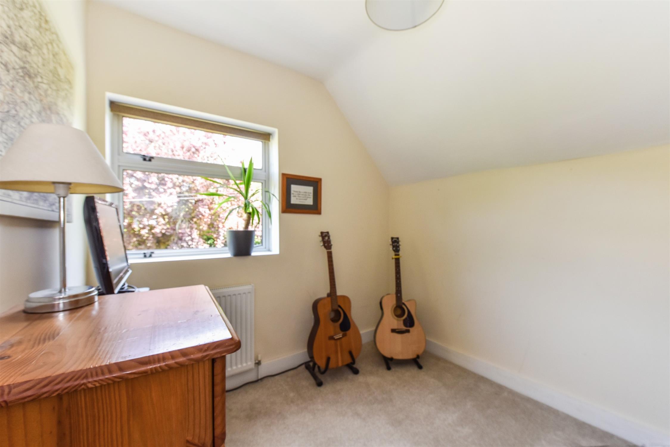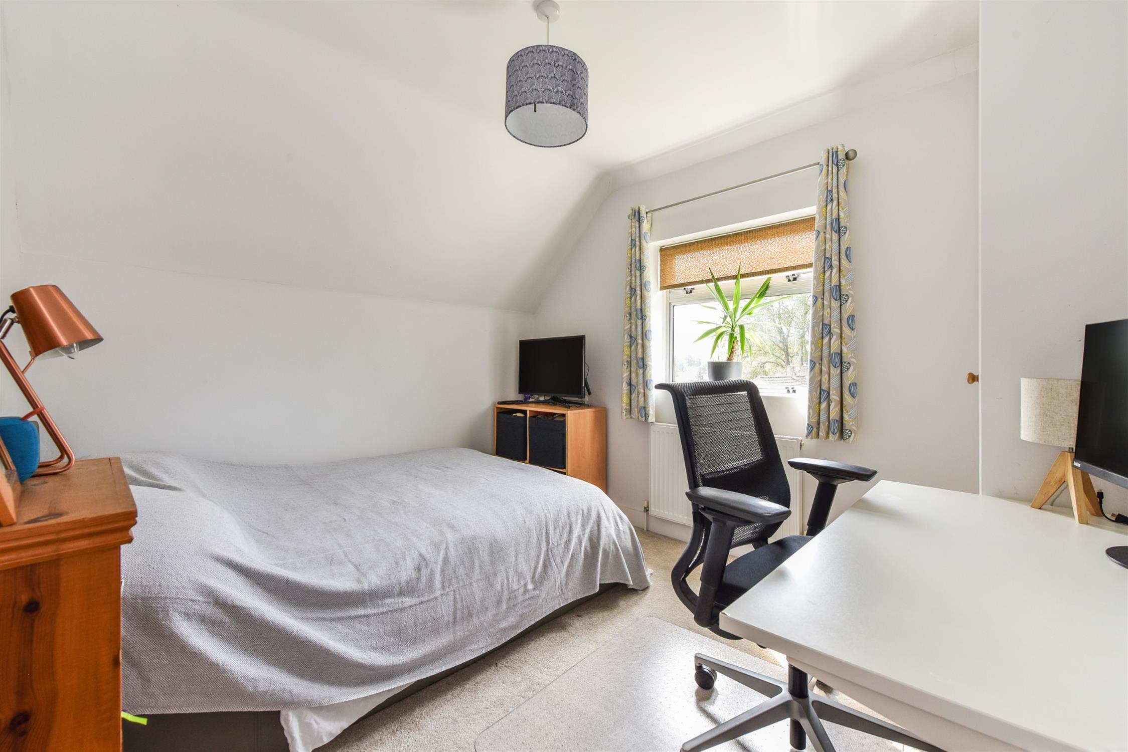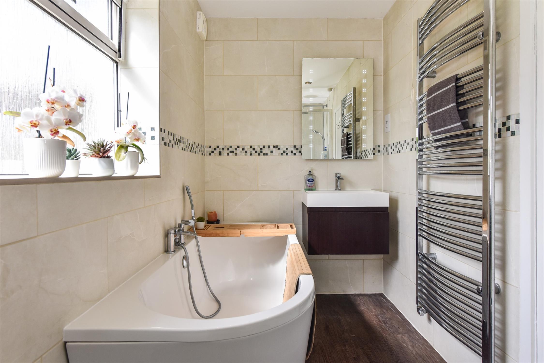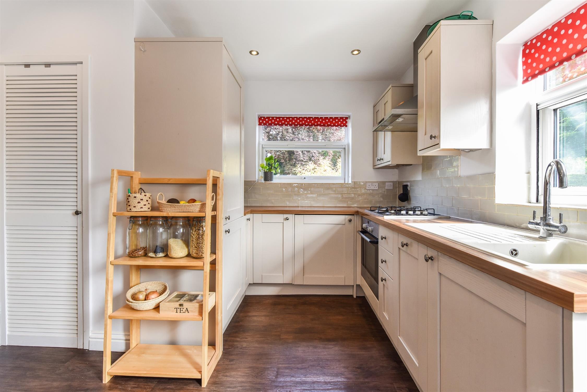 The property is set back from the road and can be approached via a pedestrian path to the front, or access from the rear. To the front of the property is a neat front garden with planted beds, lavender and lawn. Path to the front door.