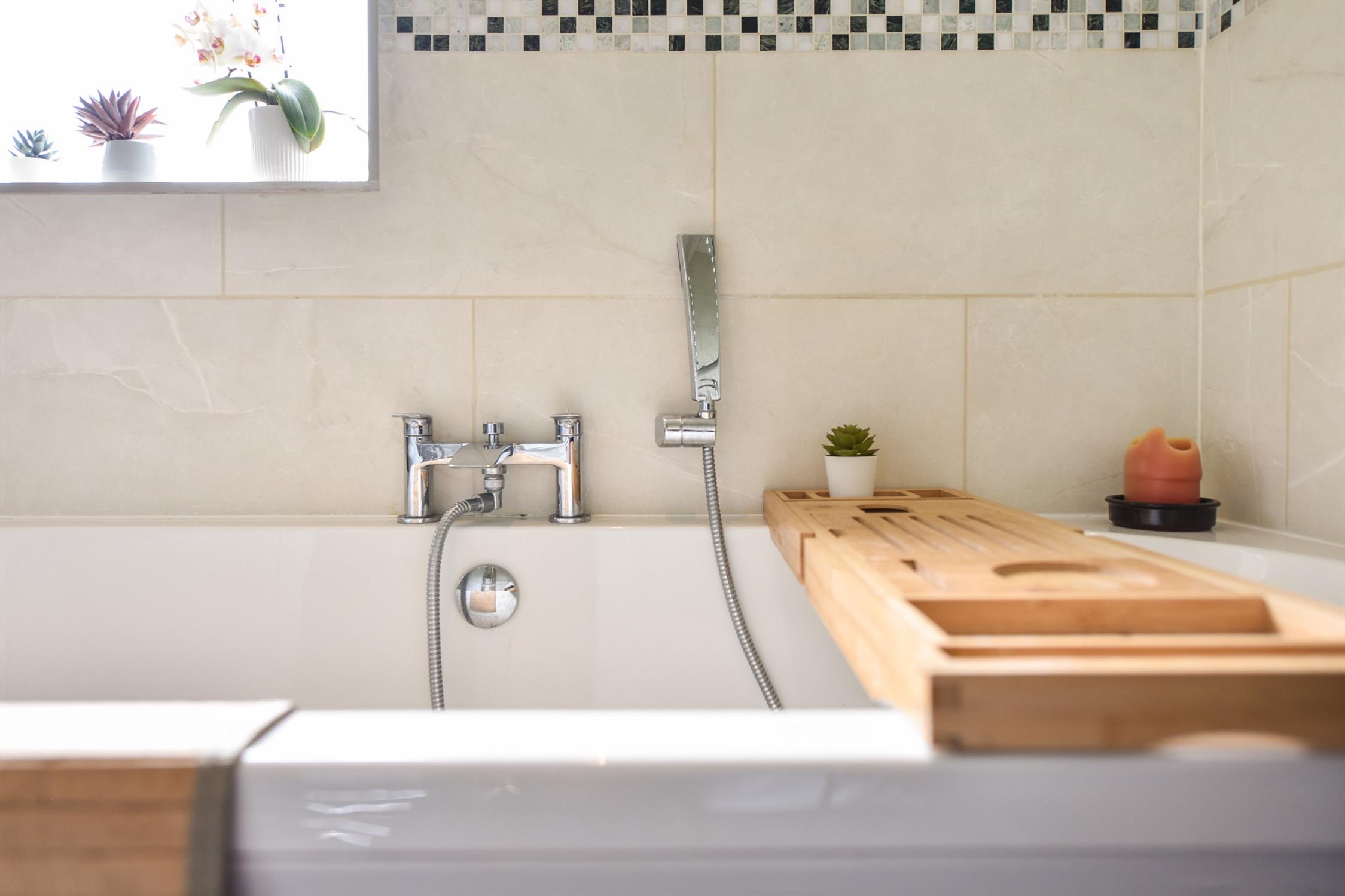 A lovely bright fully tiled bathroom with large bath, separate shower, toilet, basin with storage and lit mirror.
