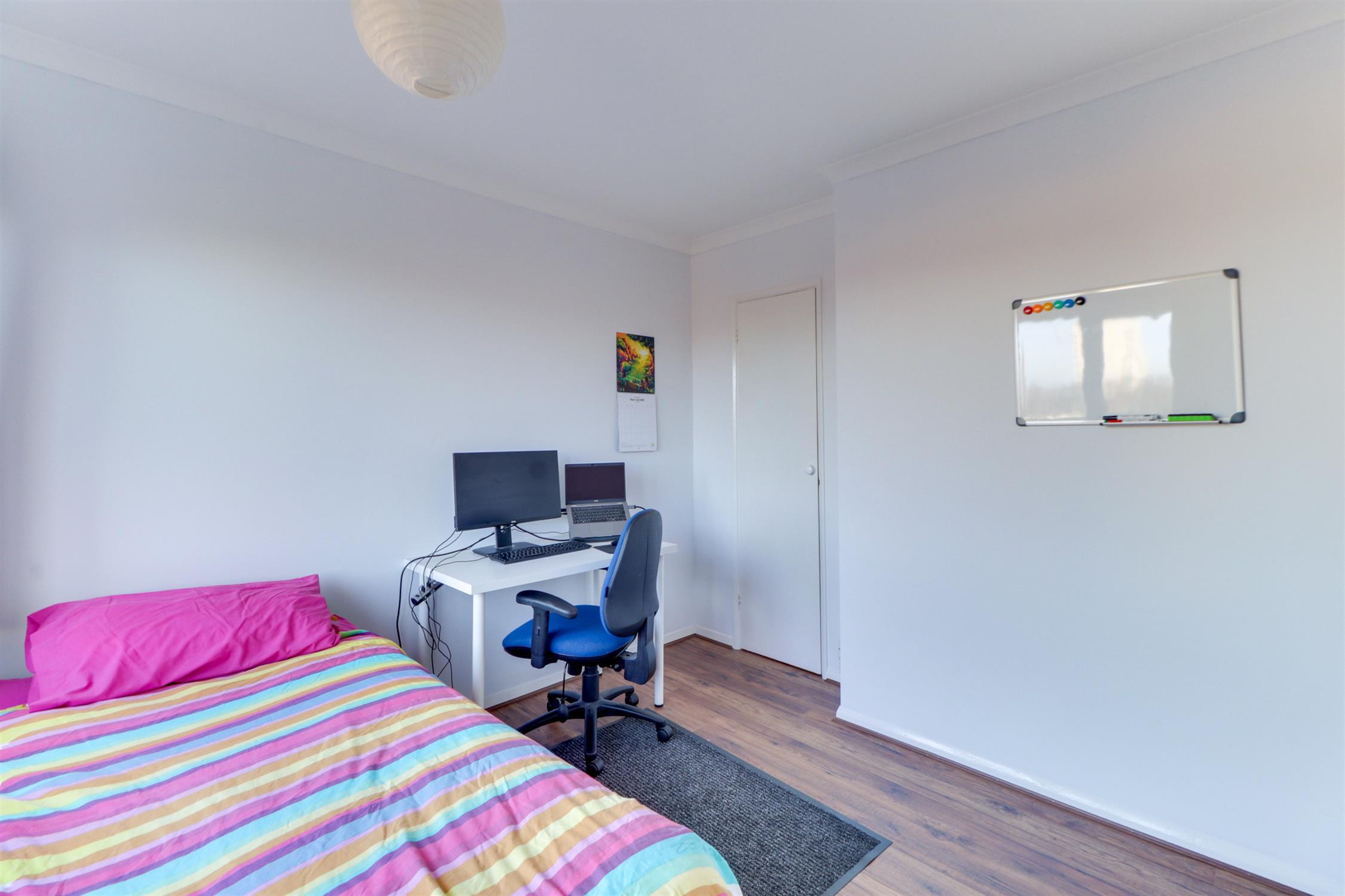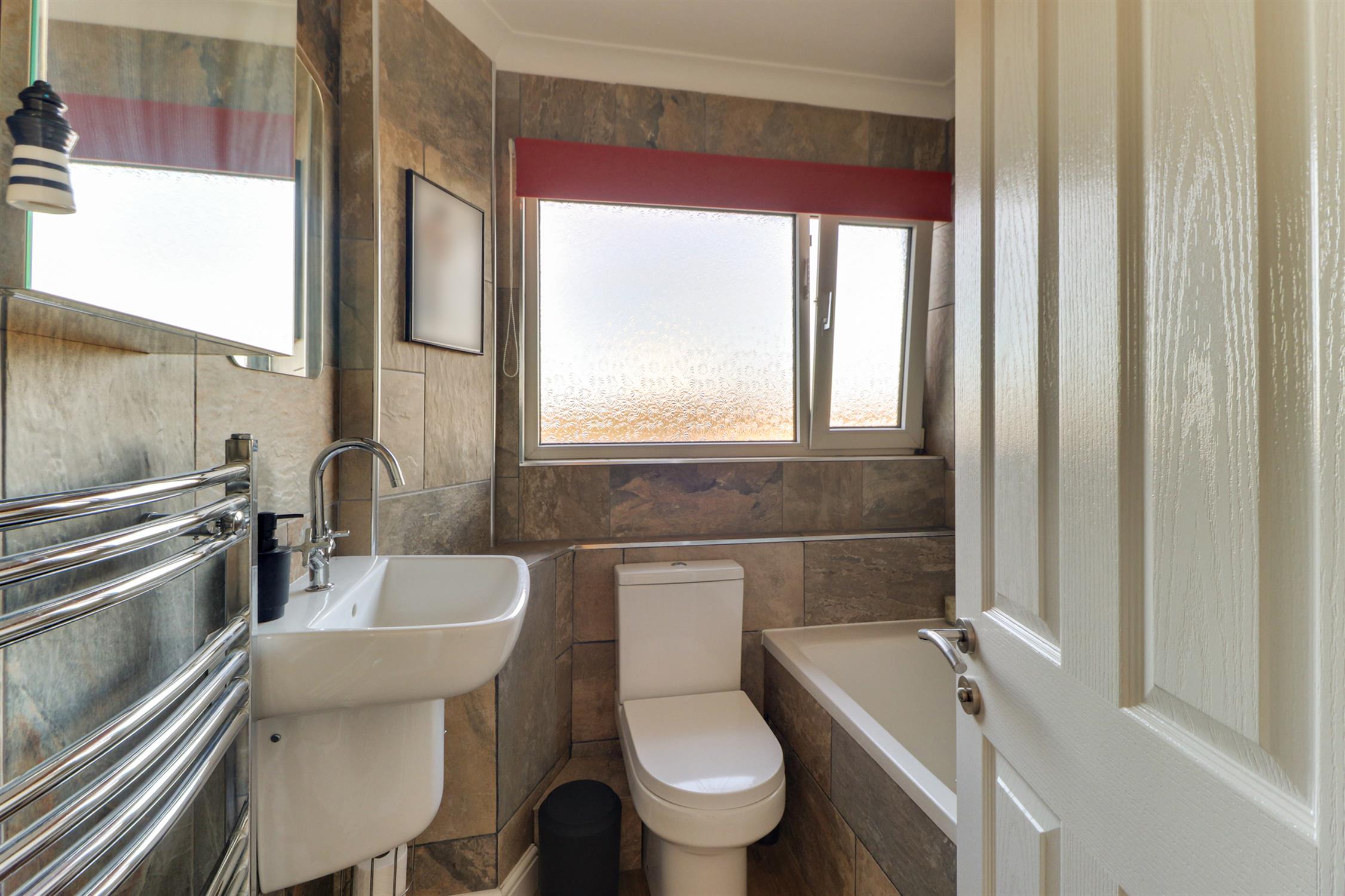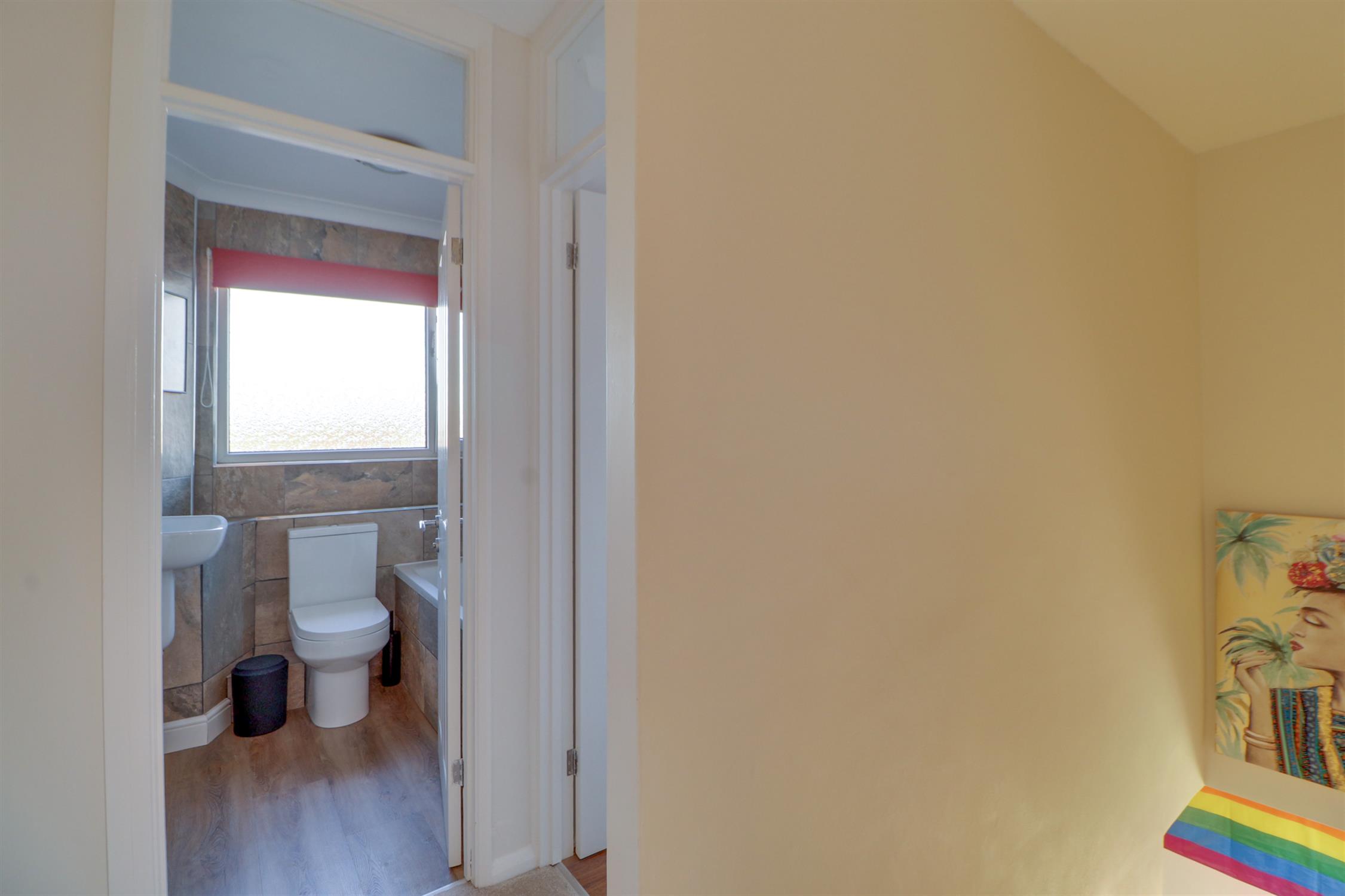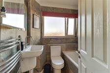The contemporary bathroom is finished with stylish wall tiling and comprises a panelled bath with shower over, wash hand basin and WC. Ideally suited for a couple or two professional sharer's.