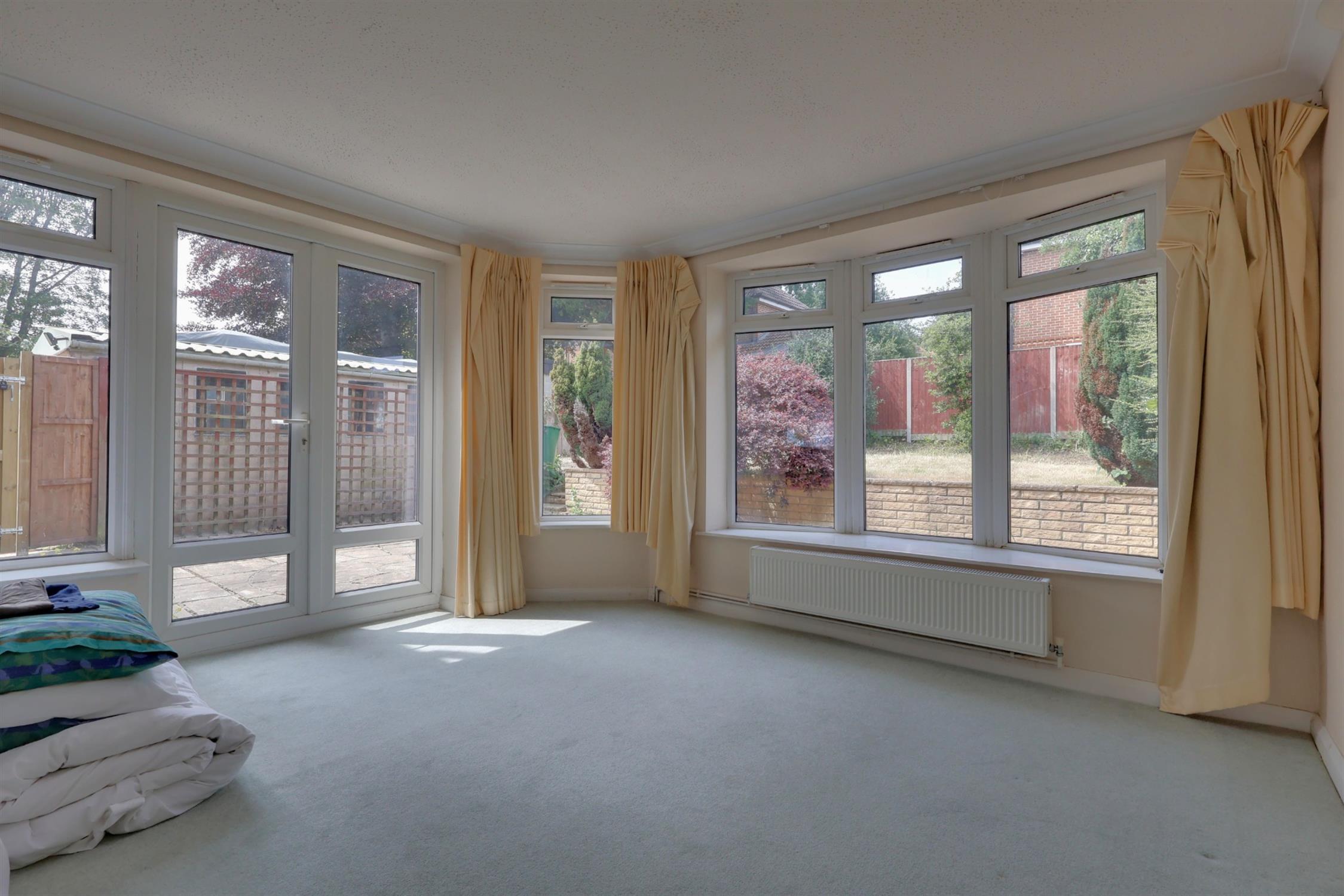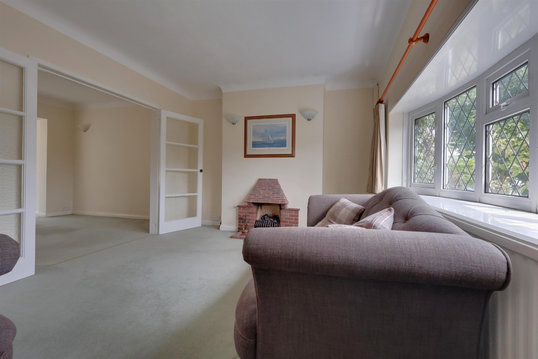 Upon entering, a welcoming porch leads into the entrance hall, offering access to the bright sitting room with its wide bow window overlooking the front garden. Glazed double doors open into the dining room, which flows seamlessly into the light-filled garden room with windows on two sides, a skylight, and double doors leading to the rear patio.