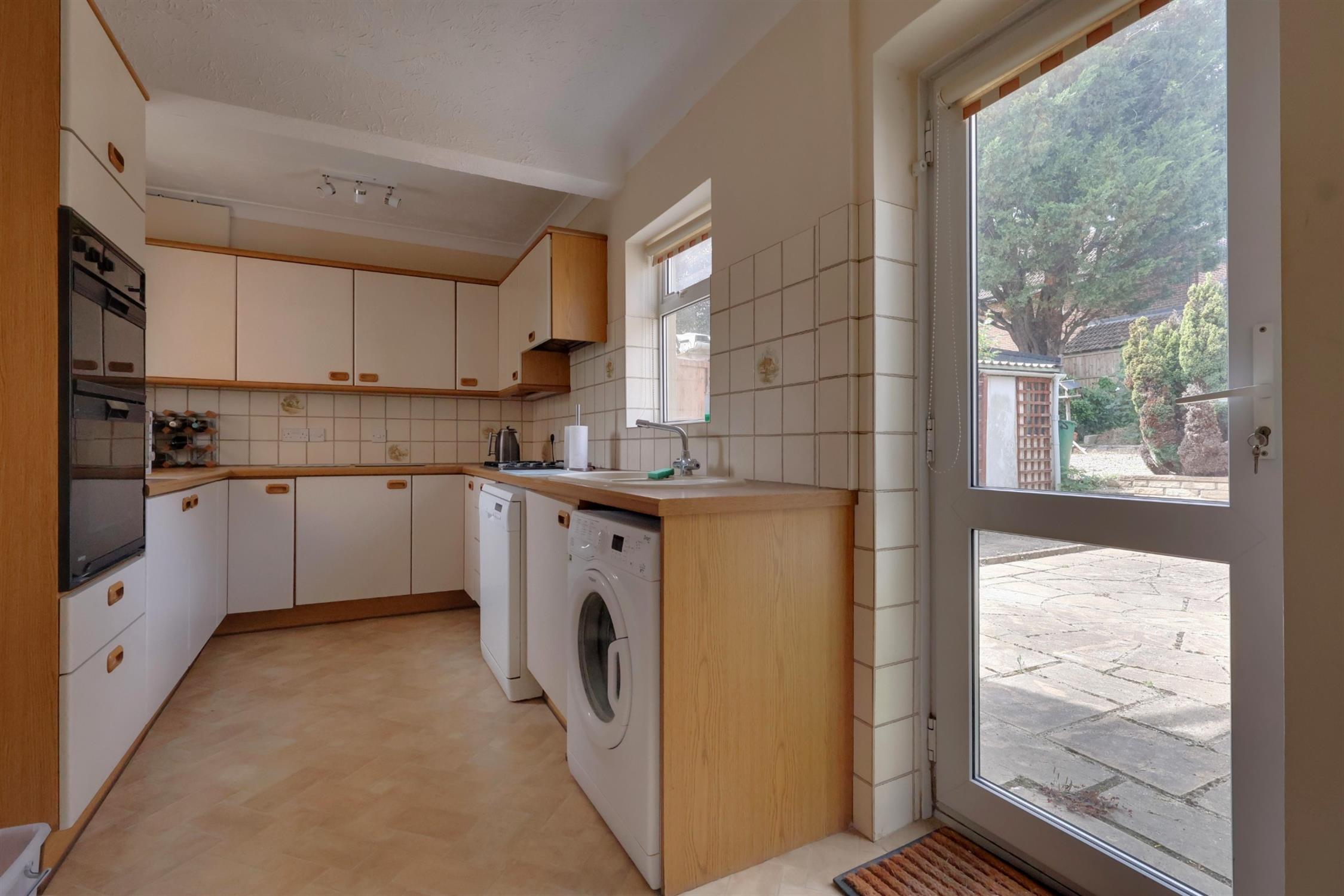 The kitchen/breakfast room, accessible from both the hallway and dining room, features a range of fitted units and integrated appliances, with space for a dishwasher, washing machine, and tumble dryer. A breakfast area and door to the rear garden complete this sociable space.