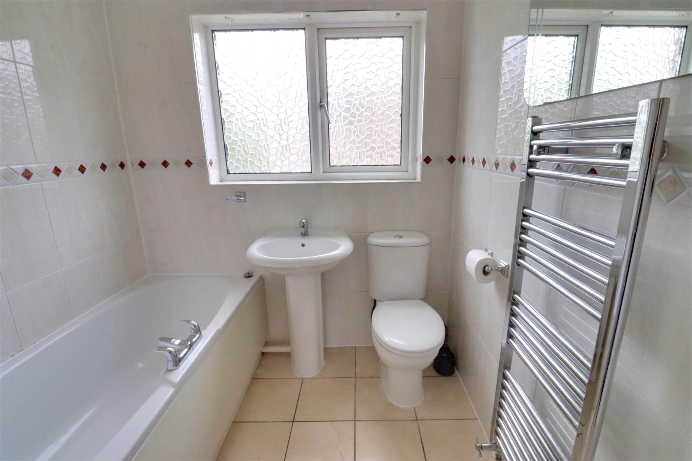 Panel enclosed bath with shower over, wash basin in pedestal, low level wc, tiled walls and flooring, rear aspect double glazed window, heated towel rail.