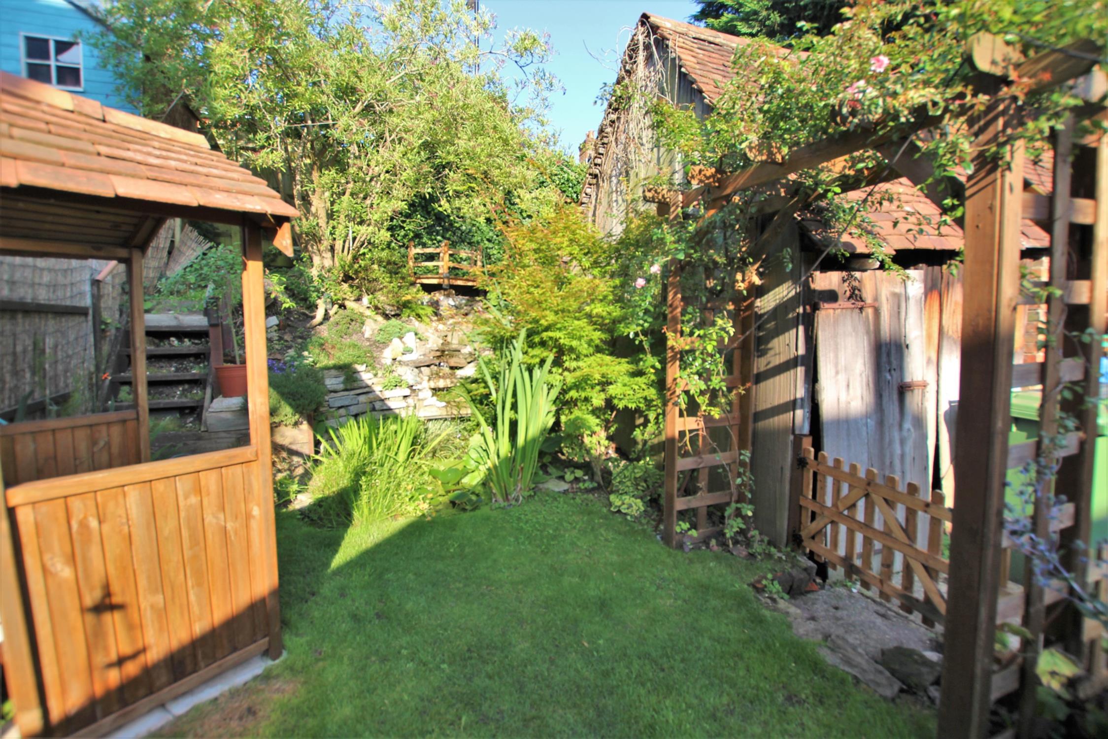 Stairs leading up to grass area, wooden pergola arch to the side leading to the storage shed and shared pathway, fence and shrub borders, steps leading up to staggered level with water fall feature, small wooden bridge and york stone wall.