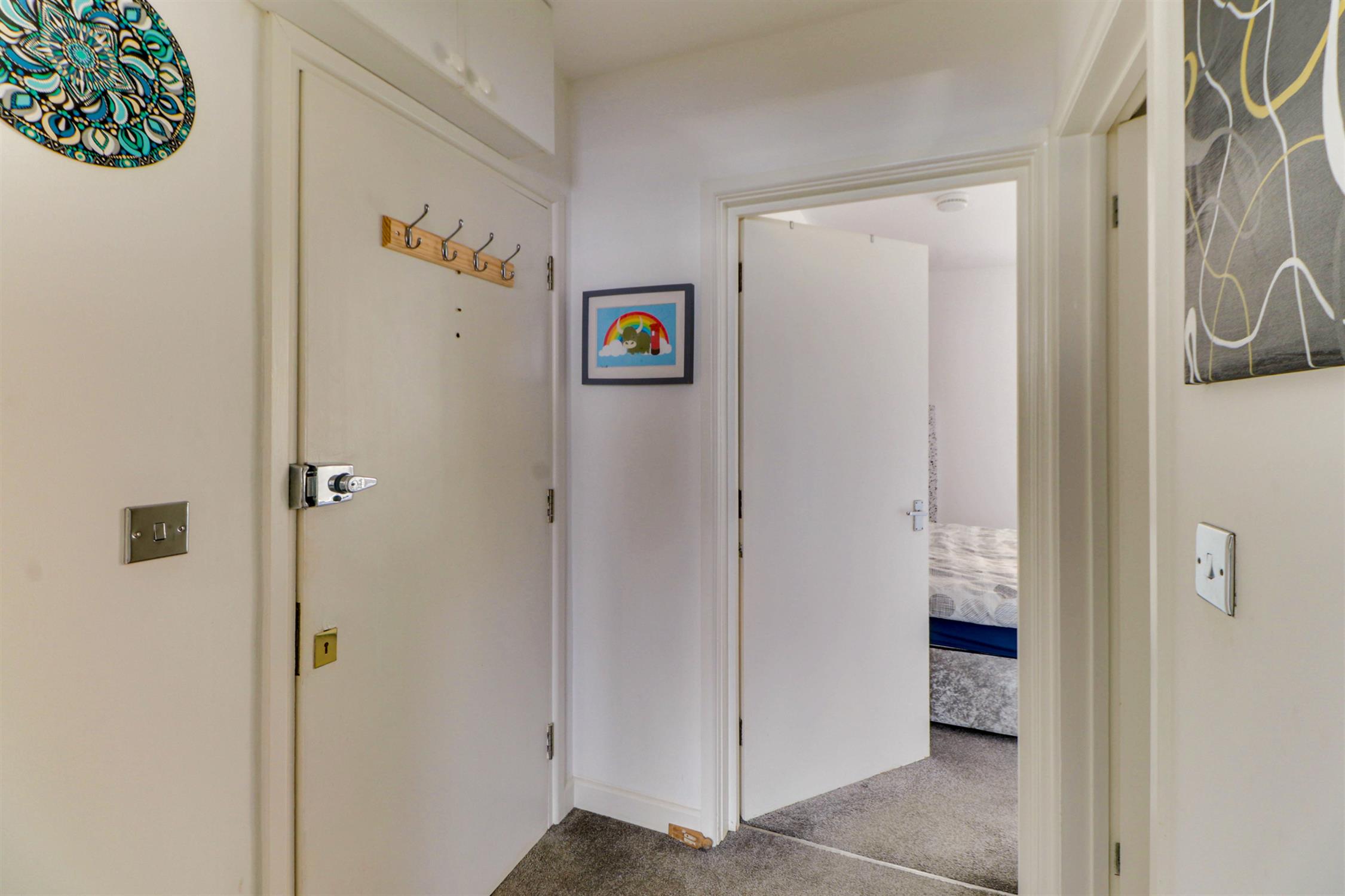 Smooth ceiling, meter cupboard, intercom entry system, thermostat, fitted carpet and doors into;