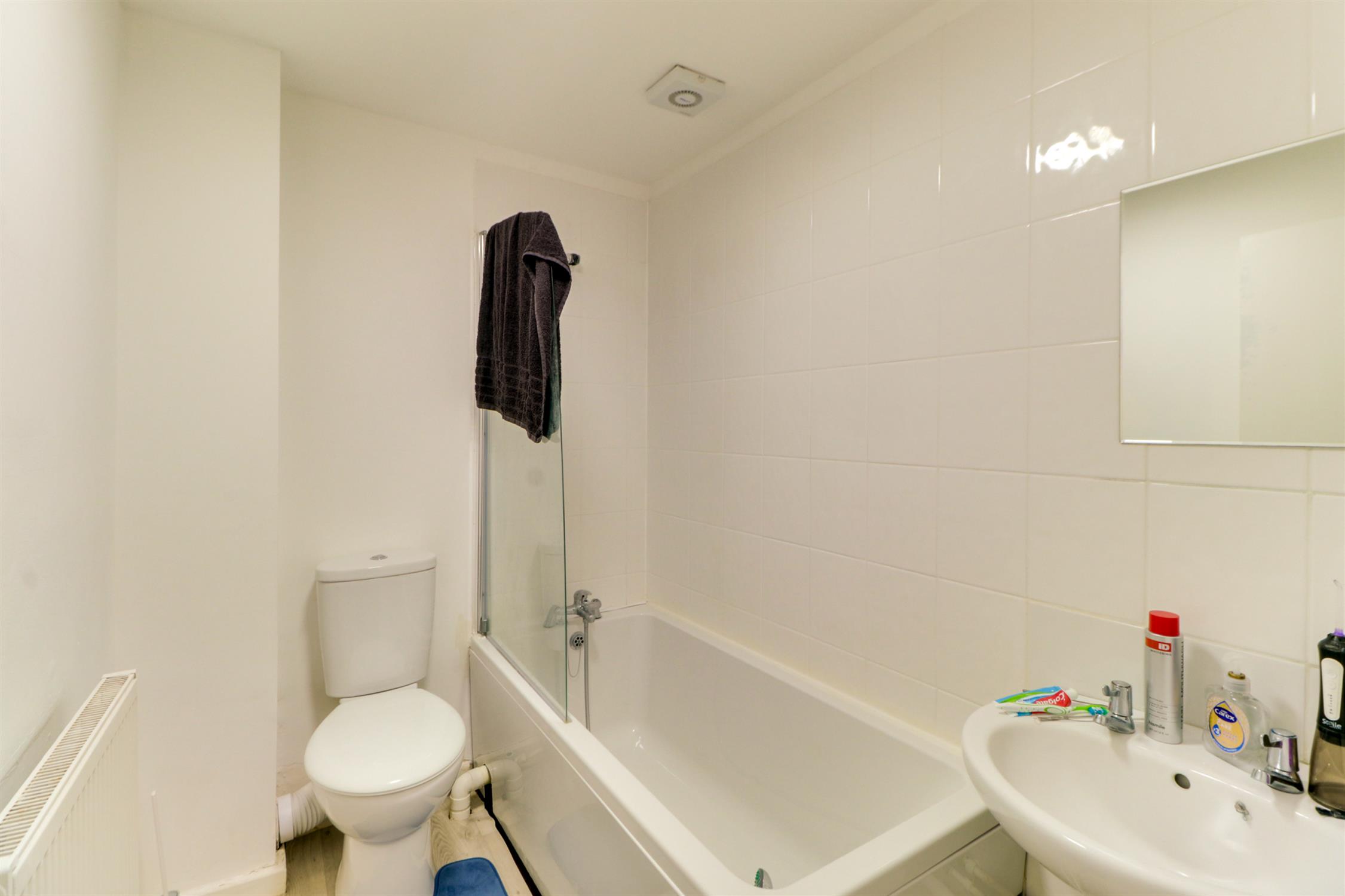 Smooth ceiling, extractor fan, bath with shower over, tiled splash back, wash hand basin, low level W.C, radiator and vinyl flooring.