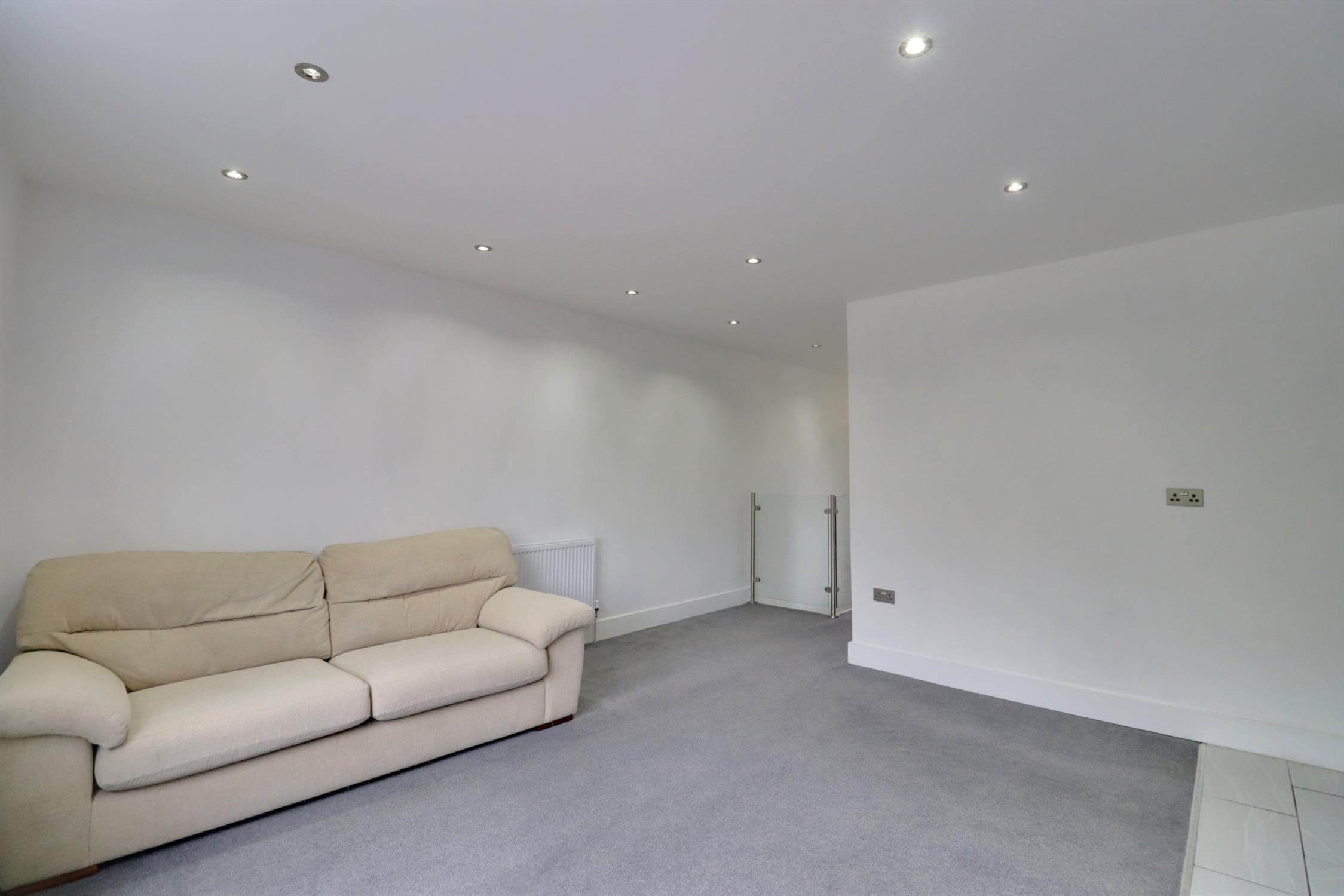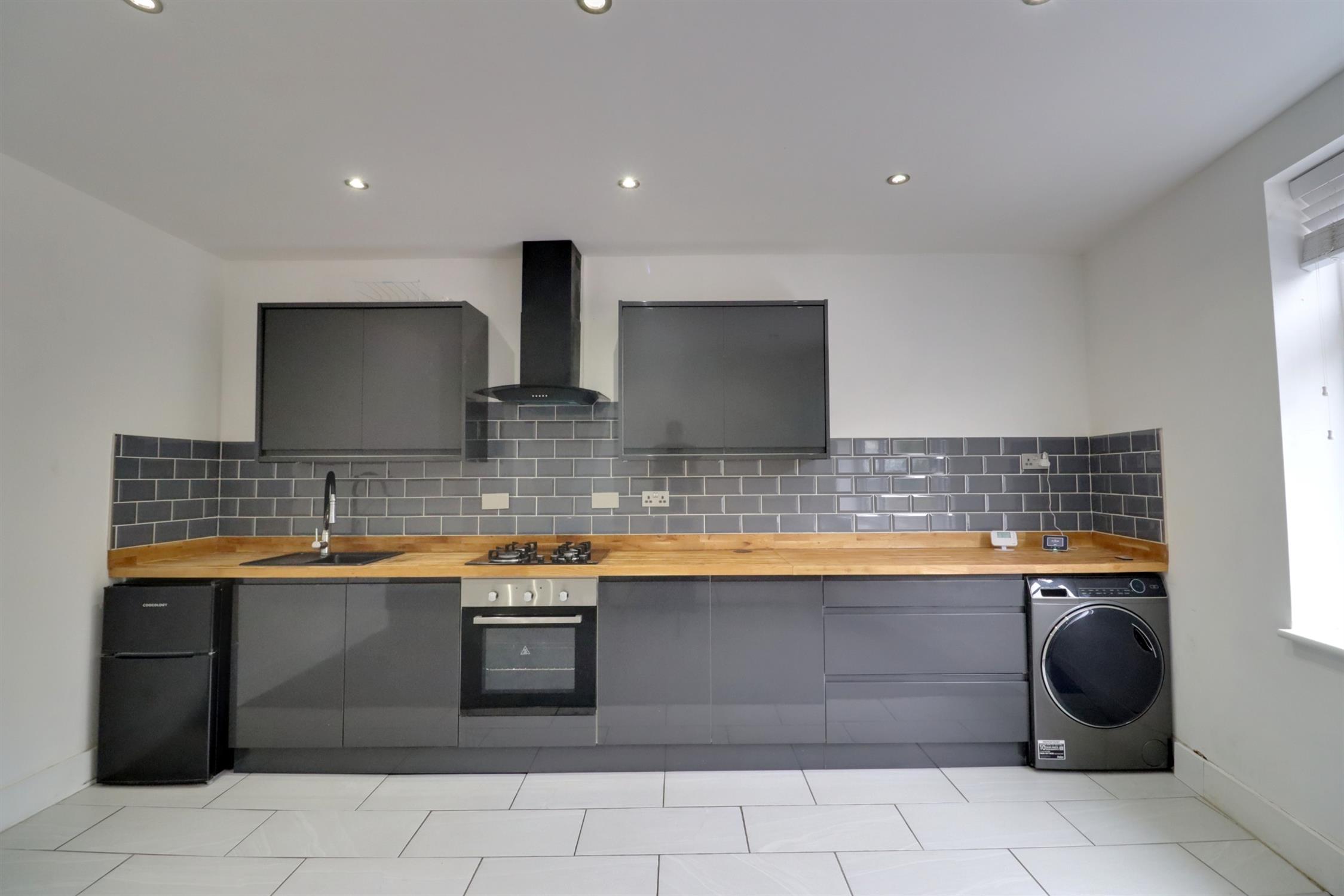 LIVING ROOM/KITCHEN - Double glazed windows to the front of the property with dark gloss wall and base units and a contrasting butcher block worktop.