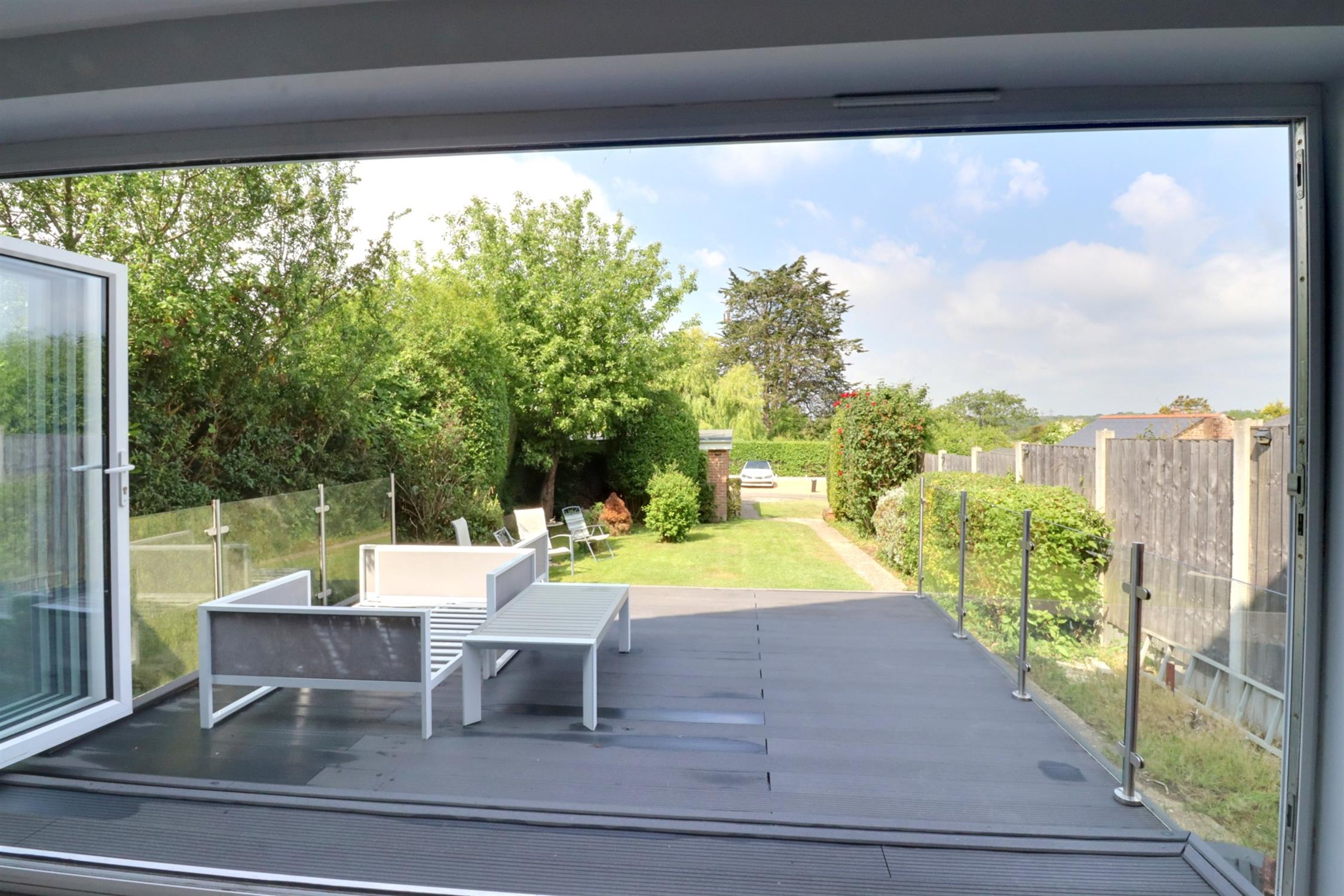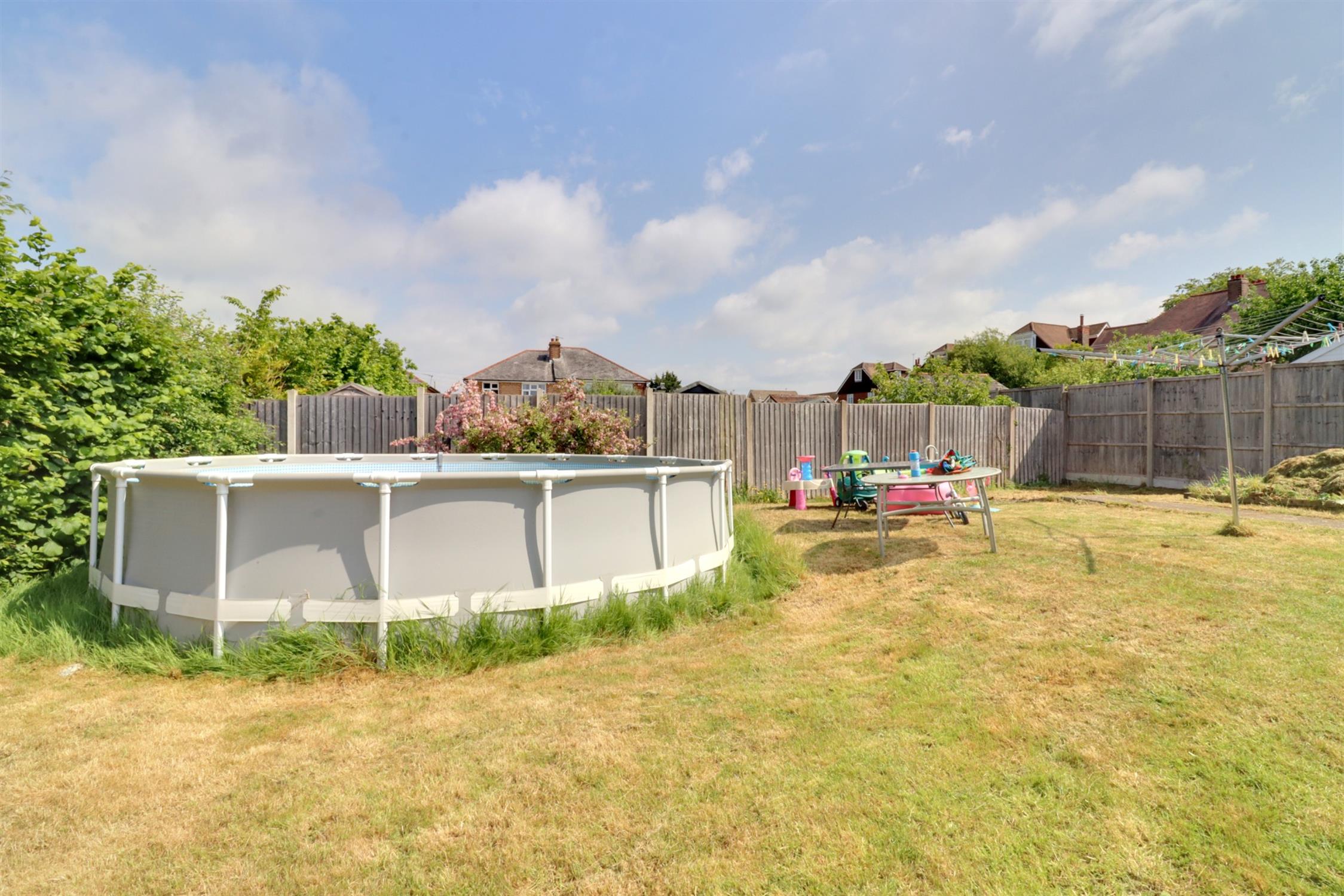 Raised composite decking with glass side panels, steps down leading to the lawn with mature shrubs, hedge and borders leading to the parking/garage with further access to the extended garden with lawns, hedge, vegetable plot, above ground swimming pool.