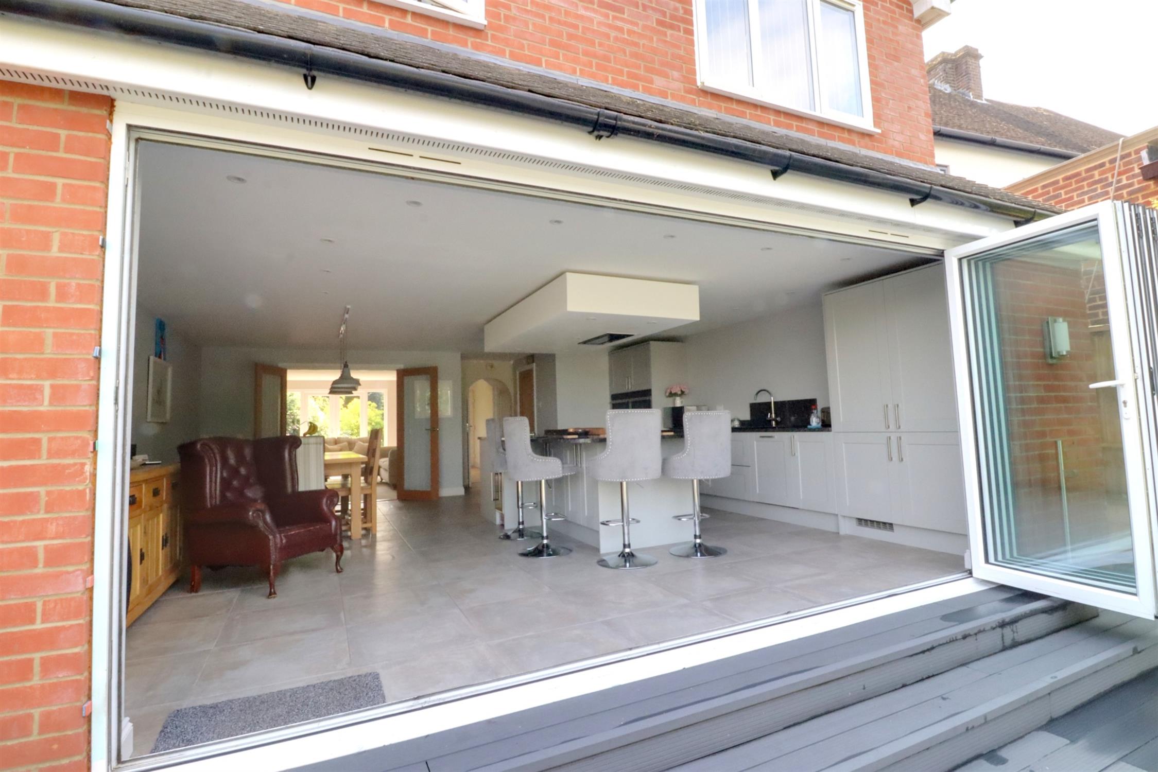 Living/Dining area: Tiled flooring, radiator, sunken spotlights, rear aspect bi-folding double glazed doors leading to the rear garden, glazed French doors leading to the lounge.