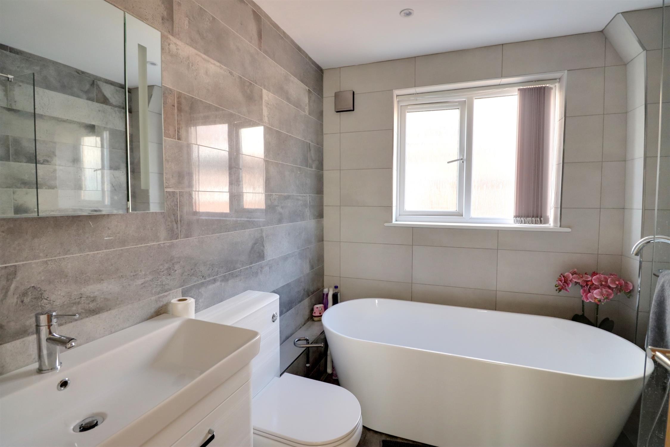 Modern four piece comprising double ended bath with separate tap with shower attachment, concealed flush WC, vanity unit, large separate shower enclosure with glass door, heated towel rail, tiled walls and flooring, side aspect double glazed window.