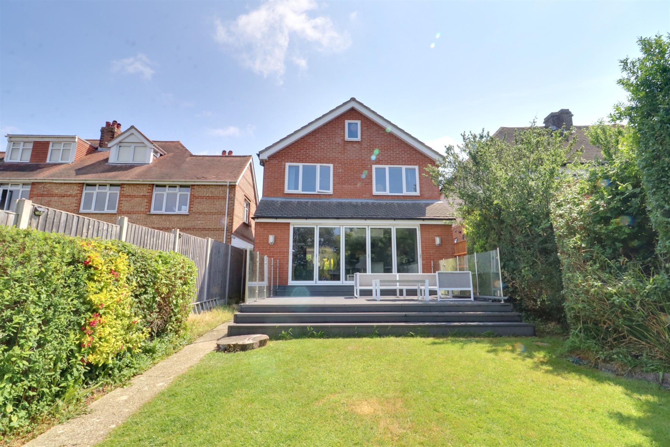 A significantly improved and extended, detached five bedroom family home, with double garage, parking for up to 10 cars and an extended rear garden plot with scope and potential to build a separate dwelling/annexe (subject to planning). The deceptive accommodation comprises on the ground floor hall, wc, lounge, an extended and impressive open-plan kitchen/living/dining room with an array of re-fitted units, integral appliances, a large island and bi-folding doors. On the first floor there are five well-proportioned bedrooms with the master having a re-fitted en-suite and further re-fitted four piece bathroom.