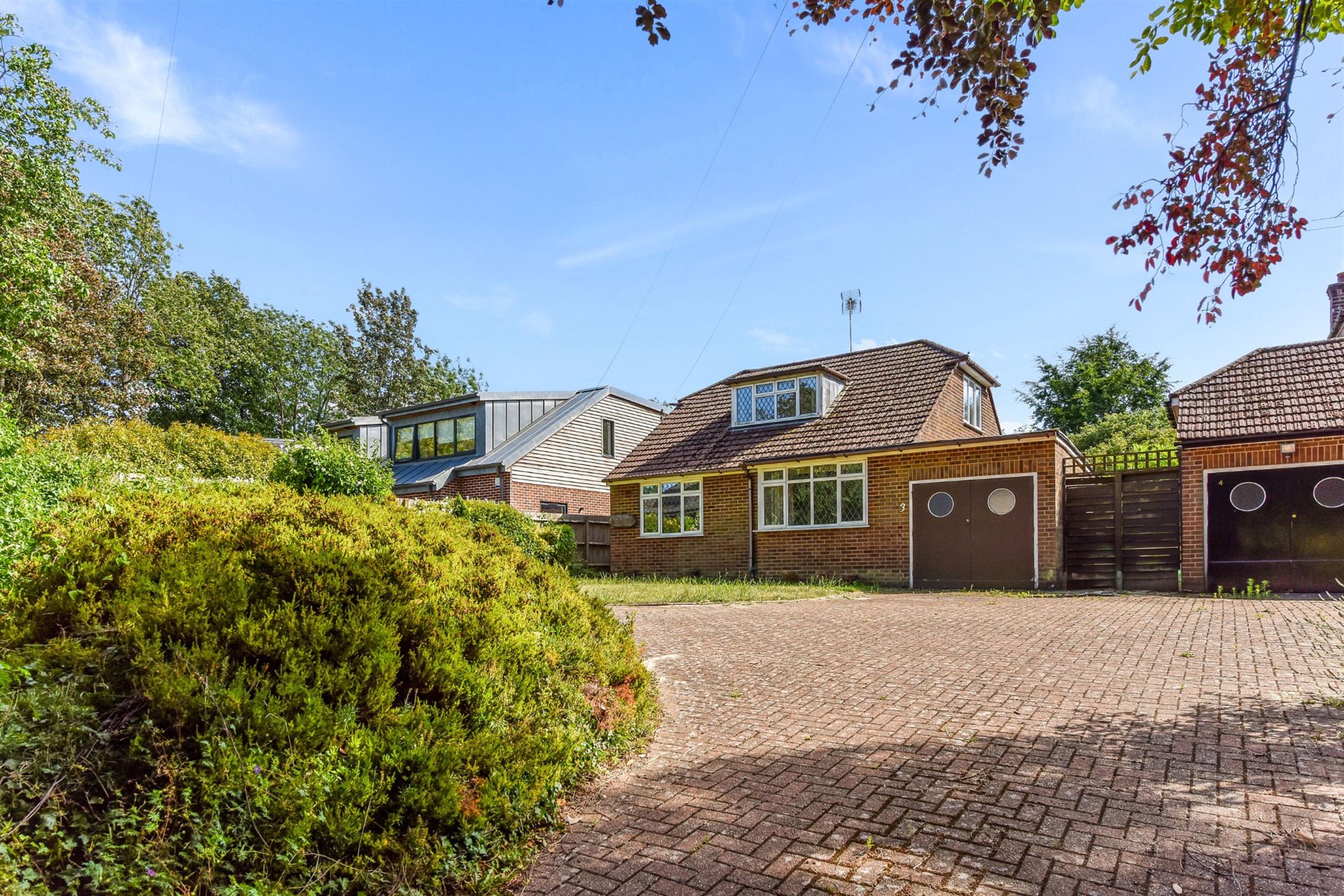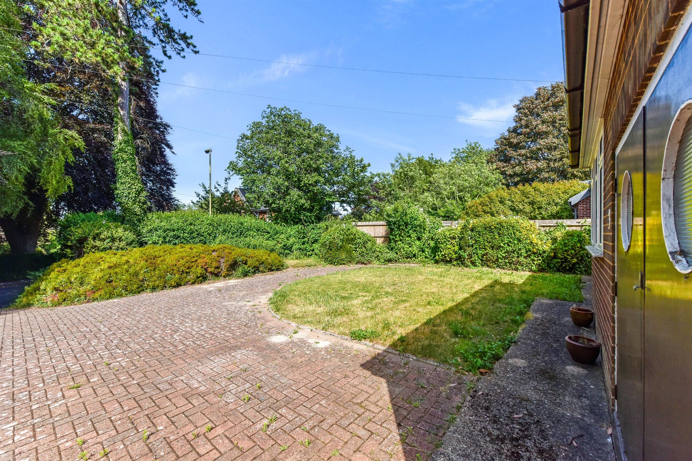 The property is set back from the road with a block-paved driveway leading to the garage. A mature hedge border offers privacy at the front and planted beds continue down alongside the path to the entrance porch. The remainder is laid to lawn.