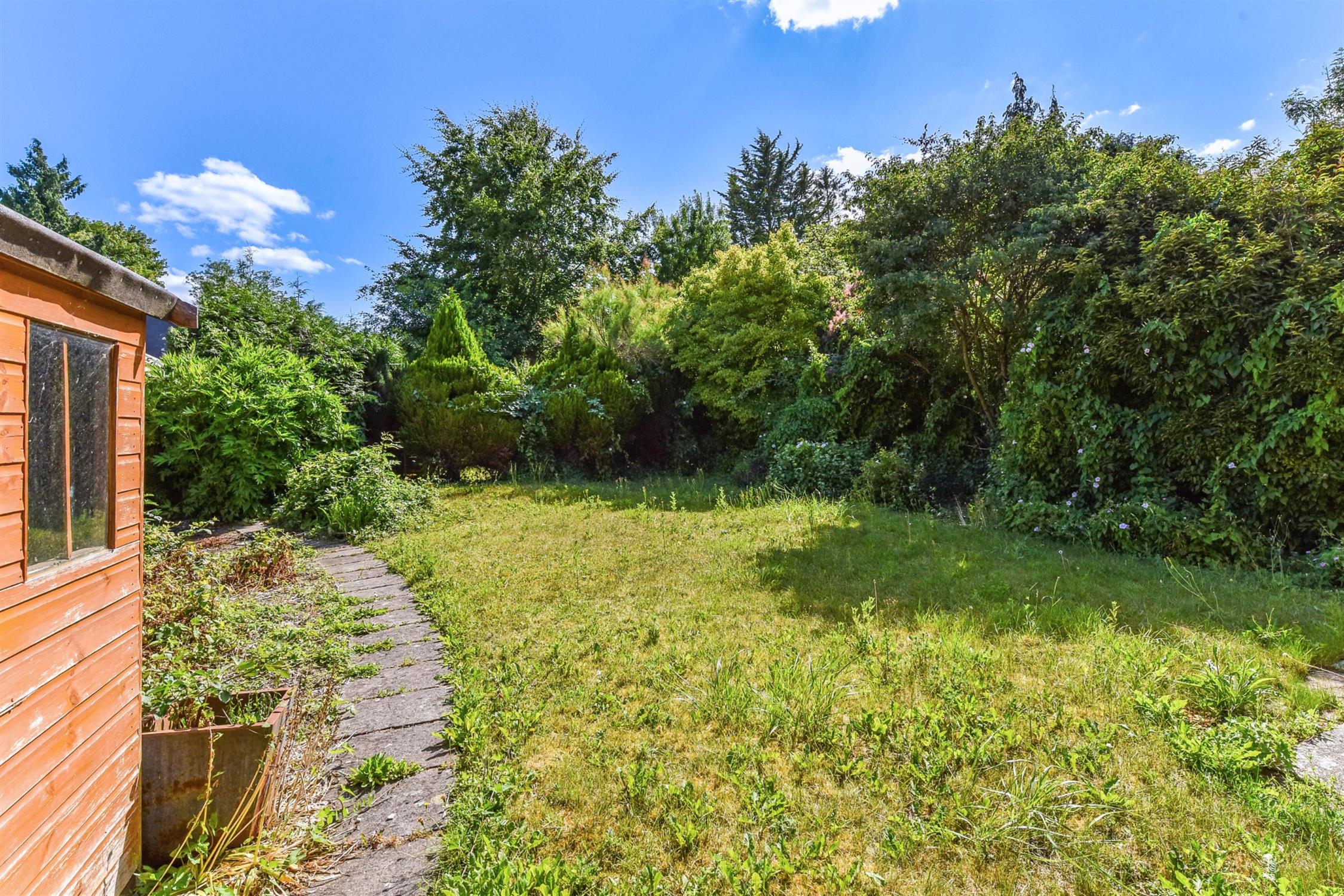 Majority laid to lawn, with patio and path. Garden shed. Rear access to garage.