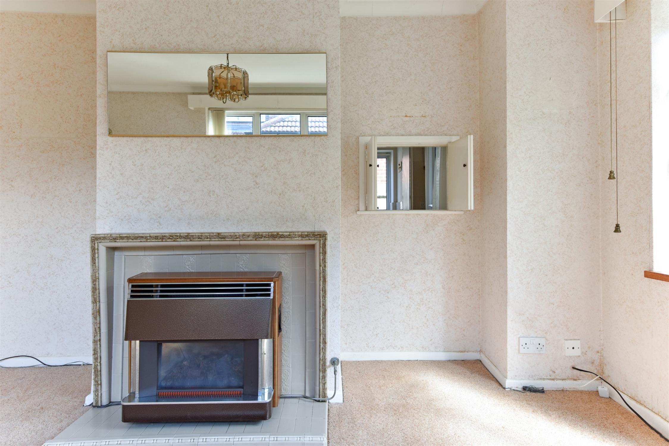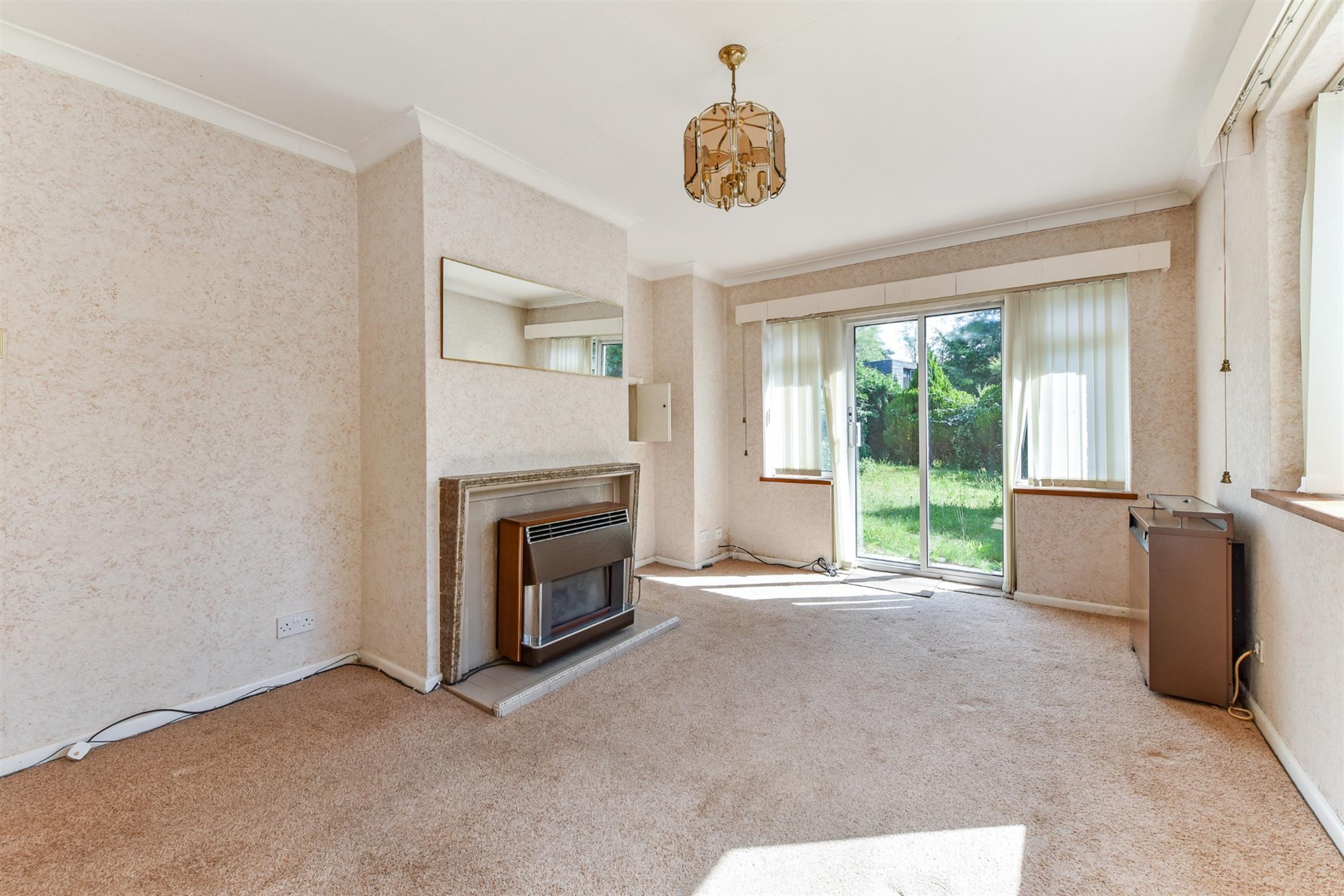 A bright double aspect room. Fireplace with tiled hearth, mantle and surround. Sliding doors to the rear garden.