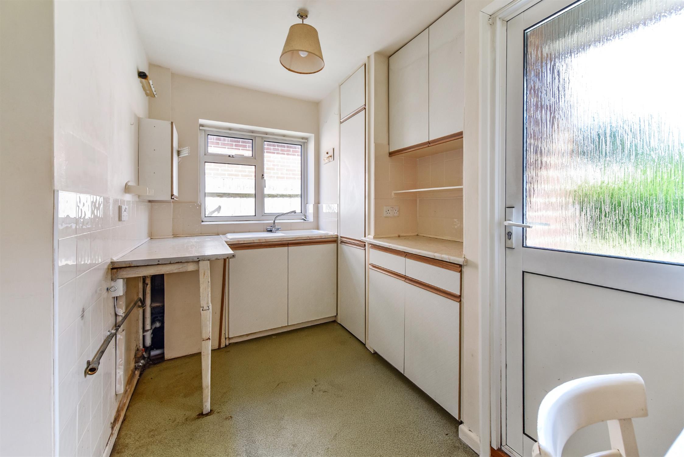 Hatch to living room. Door to the rear garden. Sink with drainer. Space for oven and utilities.