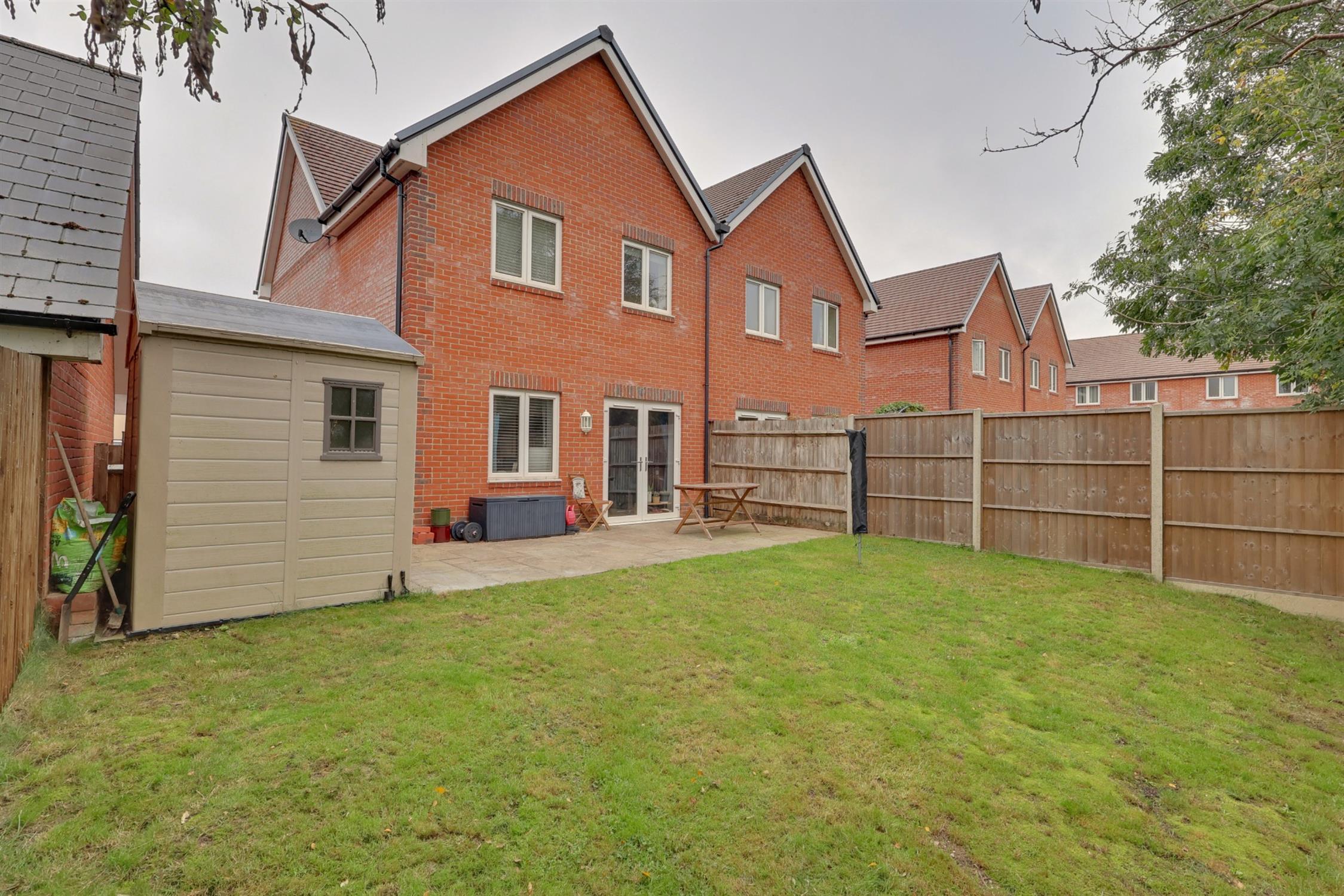 The front garden features mature shrubs and borders with a pathway leading to the front door. A driveway provides tandem off-road parking for two vehicles. The rear garden is mainly laid to lawn with timber fencing, a garden shed and side pedestrian access.