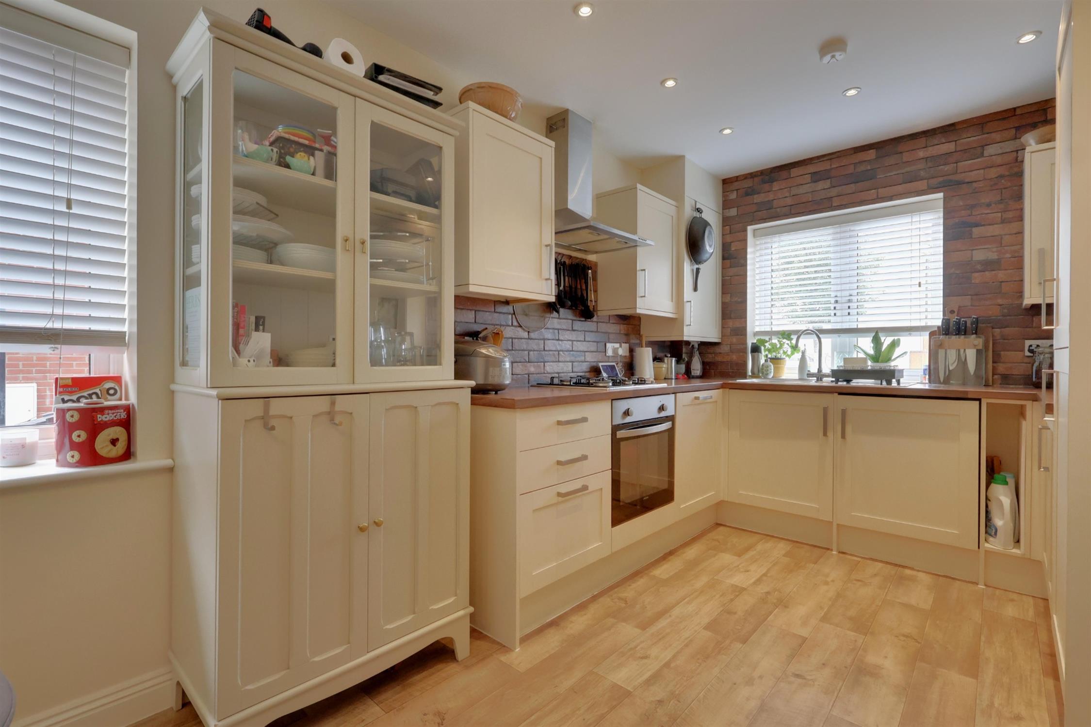 Double-glazed windows to both front and side elevations provide good natural light. Fitted with a range of wall and base units with roll-top work surfaces over, incorporating a gas hob with extractor hood above and oven below. Integrated appliances include dishwasher, fridge/freezer and washing machine. Part-tiled walls.