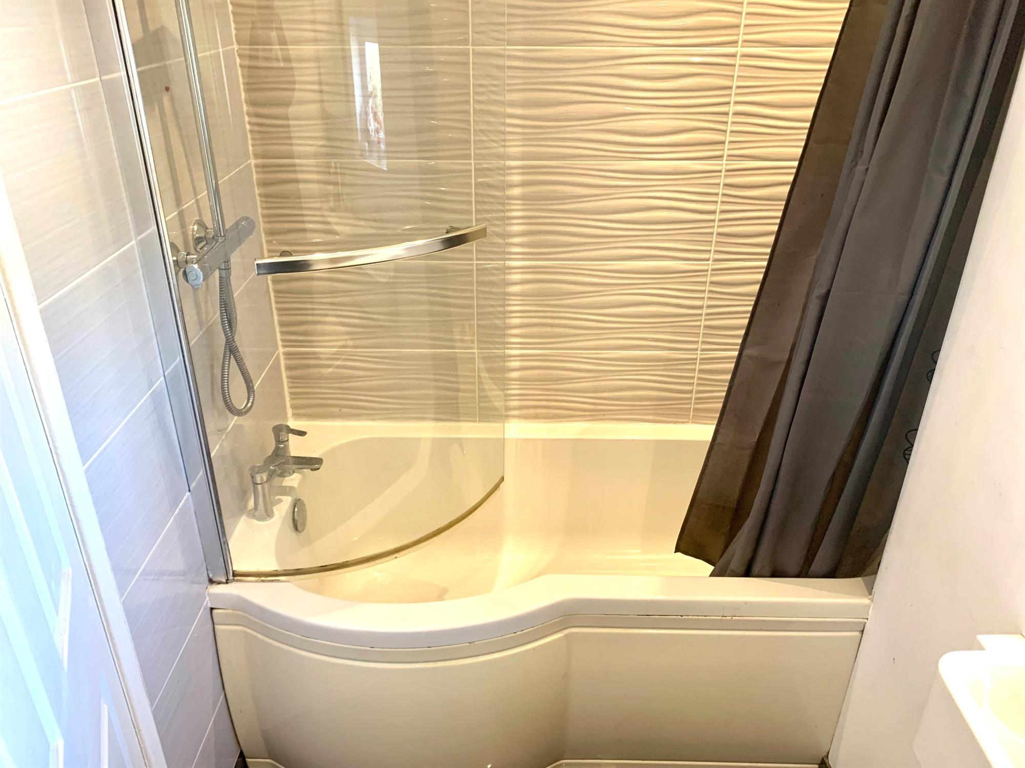 BATHROOM – White suite family bathroom with shower over the bath, sink and toilet set in vanity unit. Window to rear.