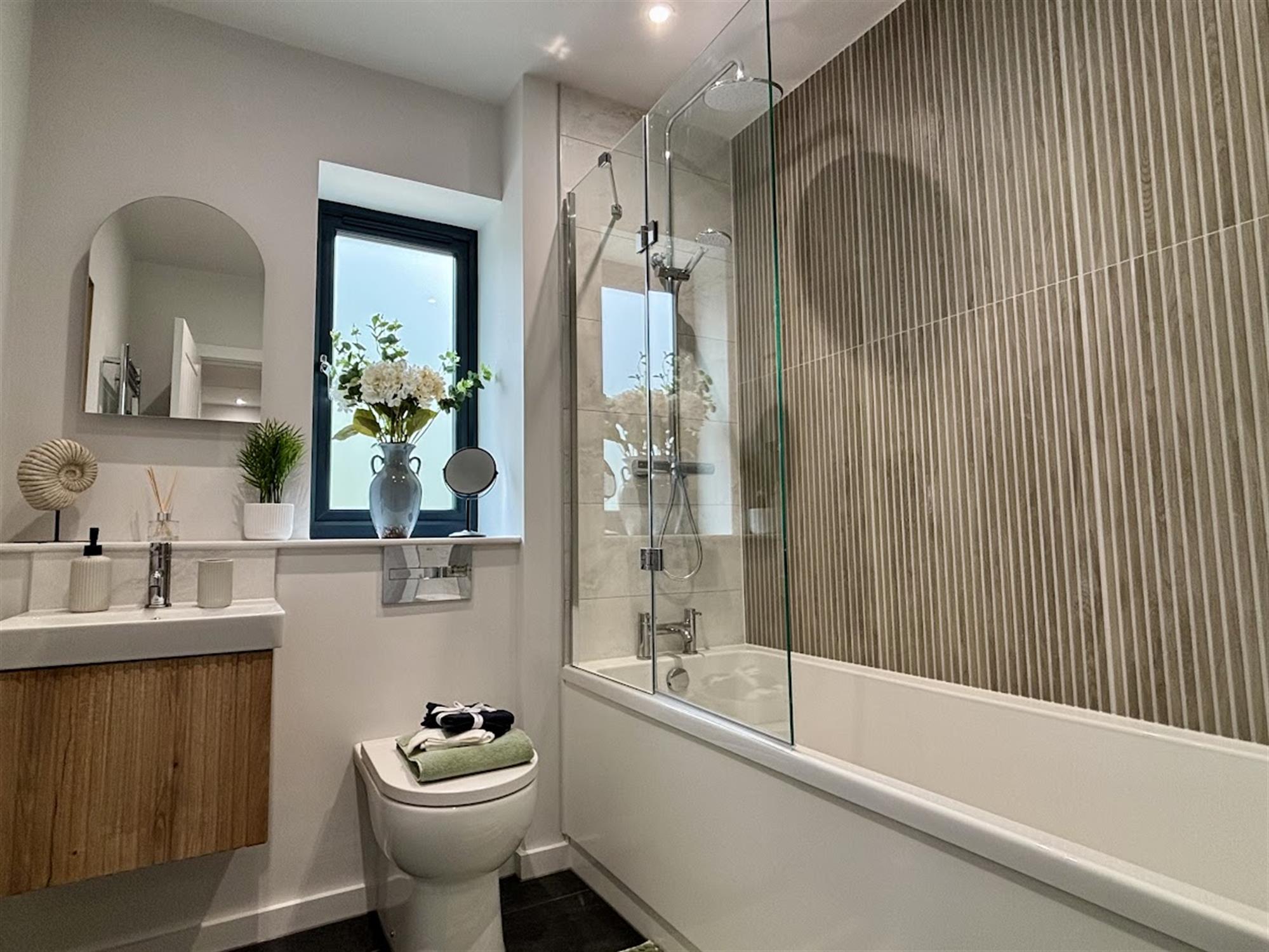 Three-piece bathroom suite with shower over bath, low-level WC, basin with vanity cupboard and a heated towel rail. Dark grey tile-style flooring and window to the rear