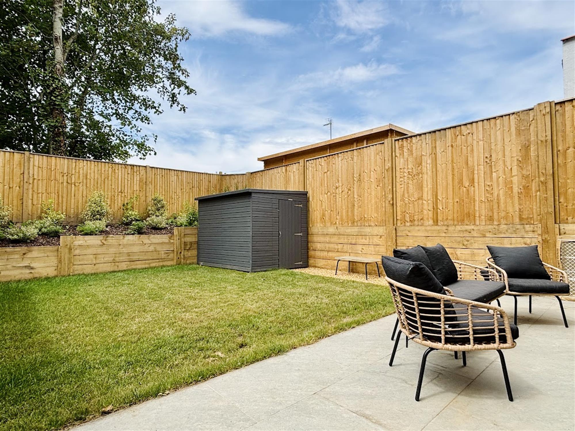The rear garden is fully enclosed, with ample patio space perfect for outdoor dining, and a low-maintenance lawn area and raised planters. The garden also comes with a shed providing outside storage, and a side access gate leading to the front of the property.