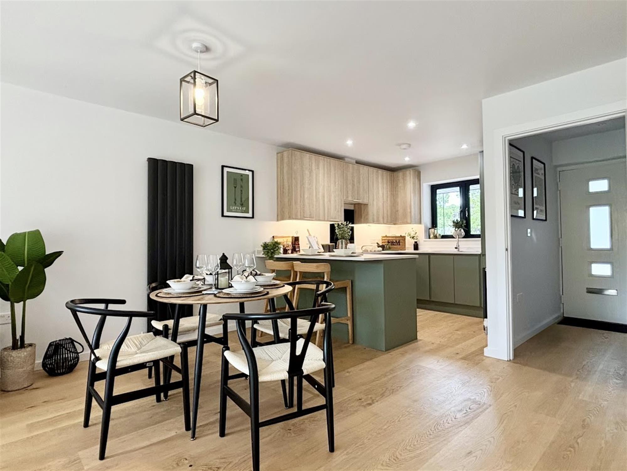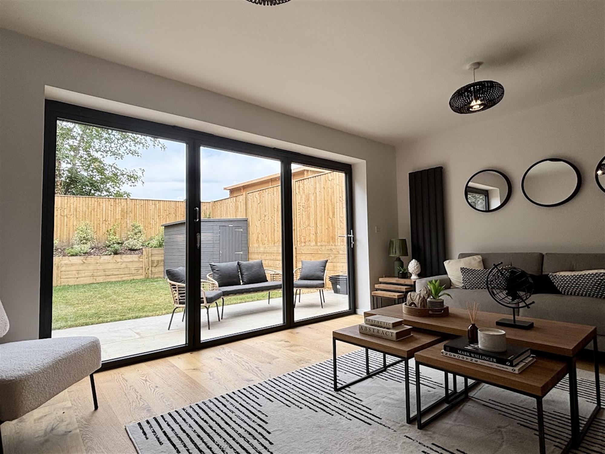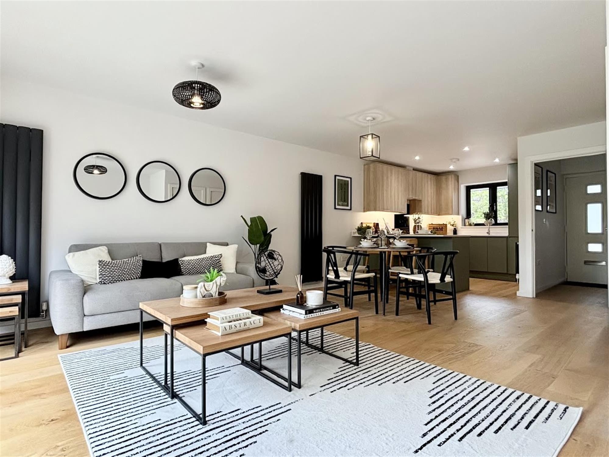 Modern open-plan living space, with hardwood flooring throughout. The kitchen consists of a two-tone mix of wall and base units, with integrated appliances including a fridge/freezer and a dishwasher, a separate utility cupboard with space for the washing machine and a breakfast bar with a window to the front. Double-glazed bi-fold doors opening onto the rear garden give the area a bright and airy feel, with ample space for a dining section. There is a large cupboard off the lounge providing plenty of storage.
