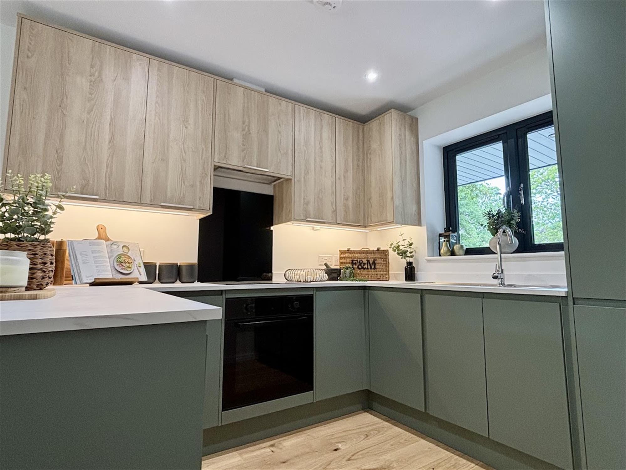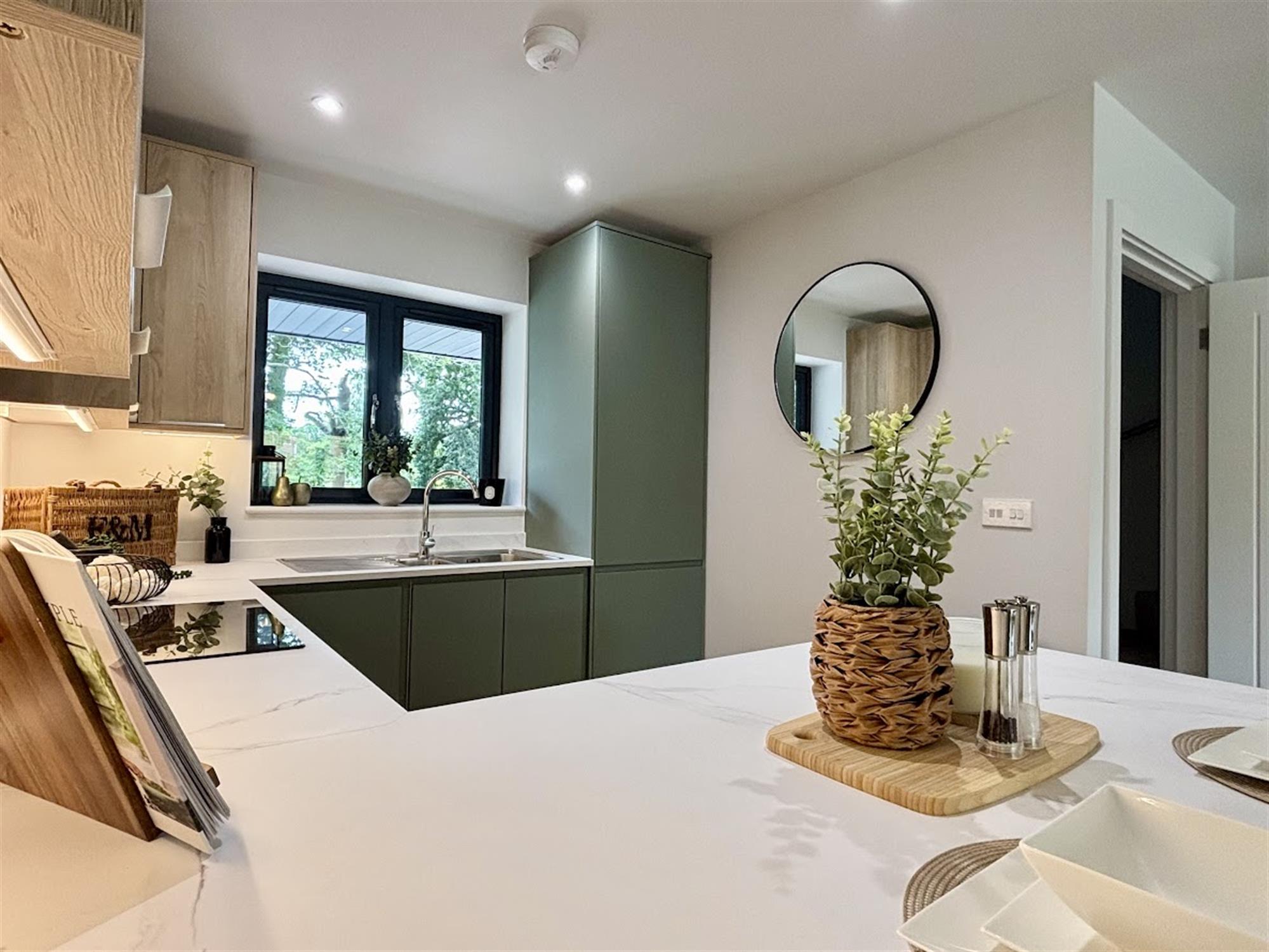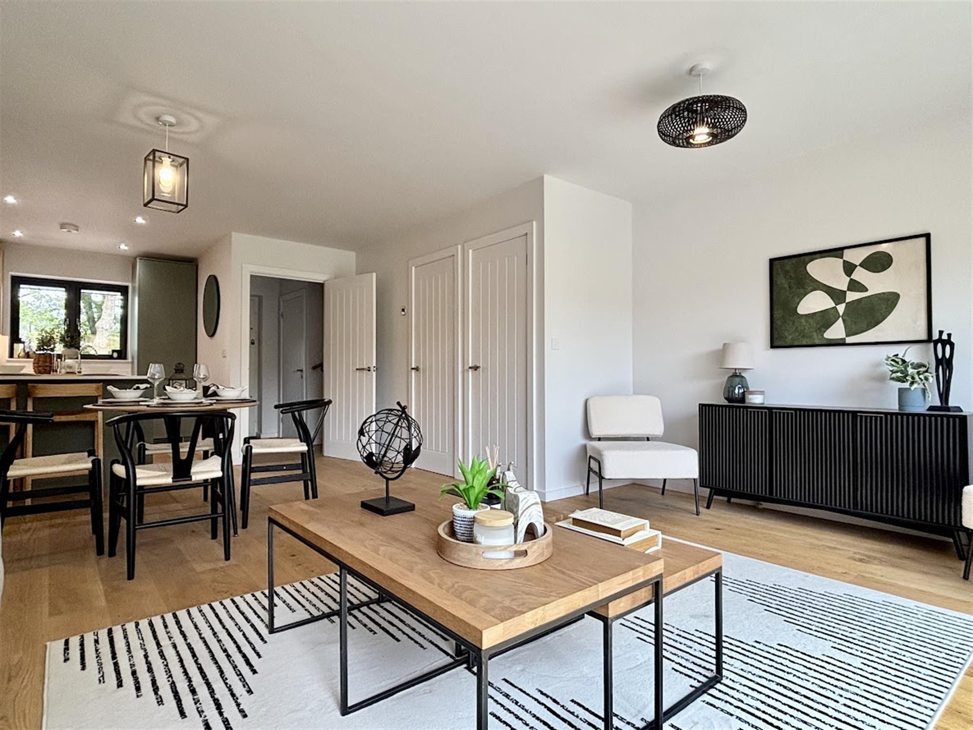 Modern open-plan living space, with hardwood flooring throughout. The kitchen consists of a two-tone mix of wall and base units, with integrated appliances including a fridge/freezer and a dishwasher, a separate utility cupboard with space for the washing machine and a breakfast bar with a window to the front. Double-glazed bi-fold doors opening onto the rear garden give the area a bright and airy feel, with ample space for a dining section. There is a large cupboard off the lounge providing plenty of storage.