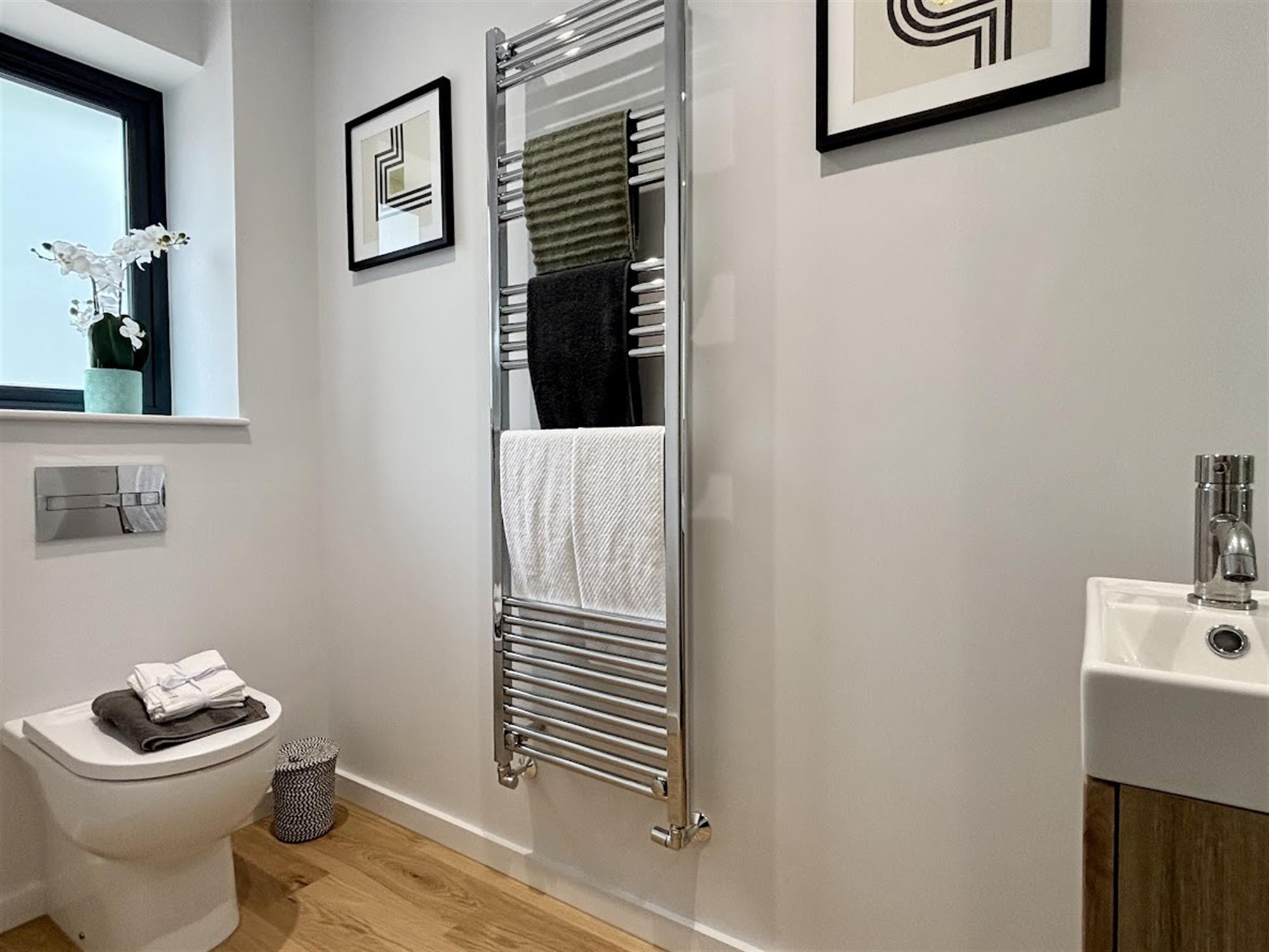 Hardwood flooring, with window to the front, fitted with a low-level WC, basin with vanity and heated towel rail.