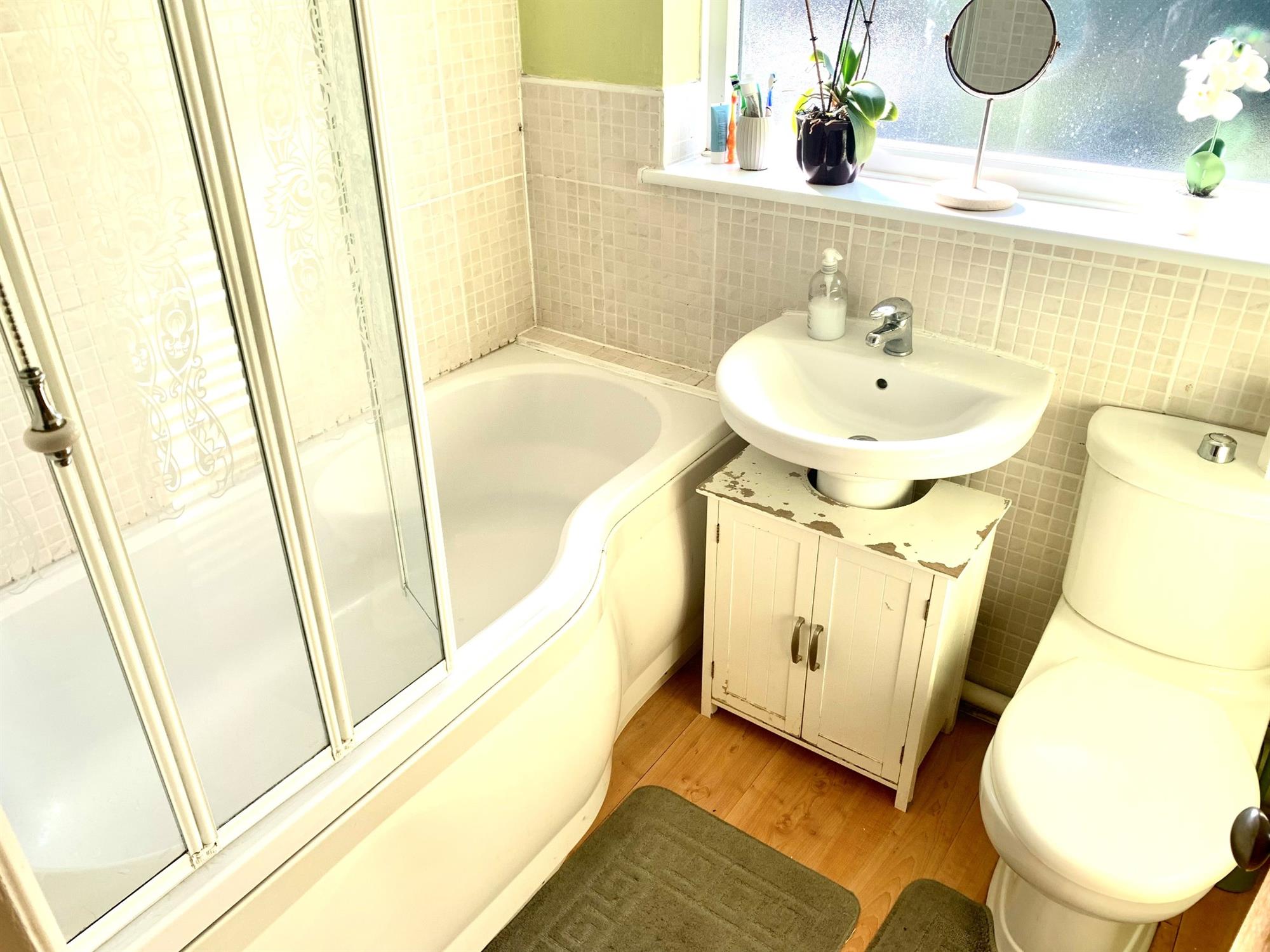 BATHROOM – White suite family bathroom with electric shower over the bath, sink and toilet. Window to rear.