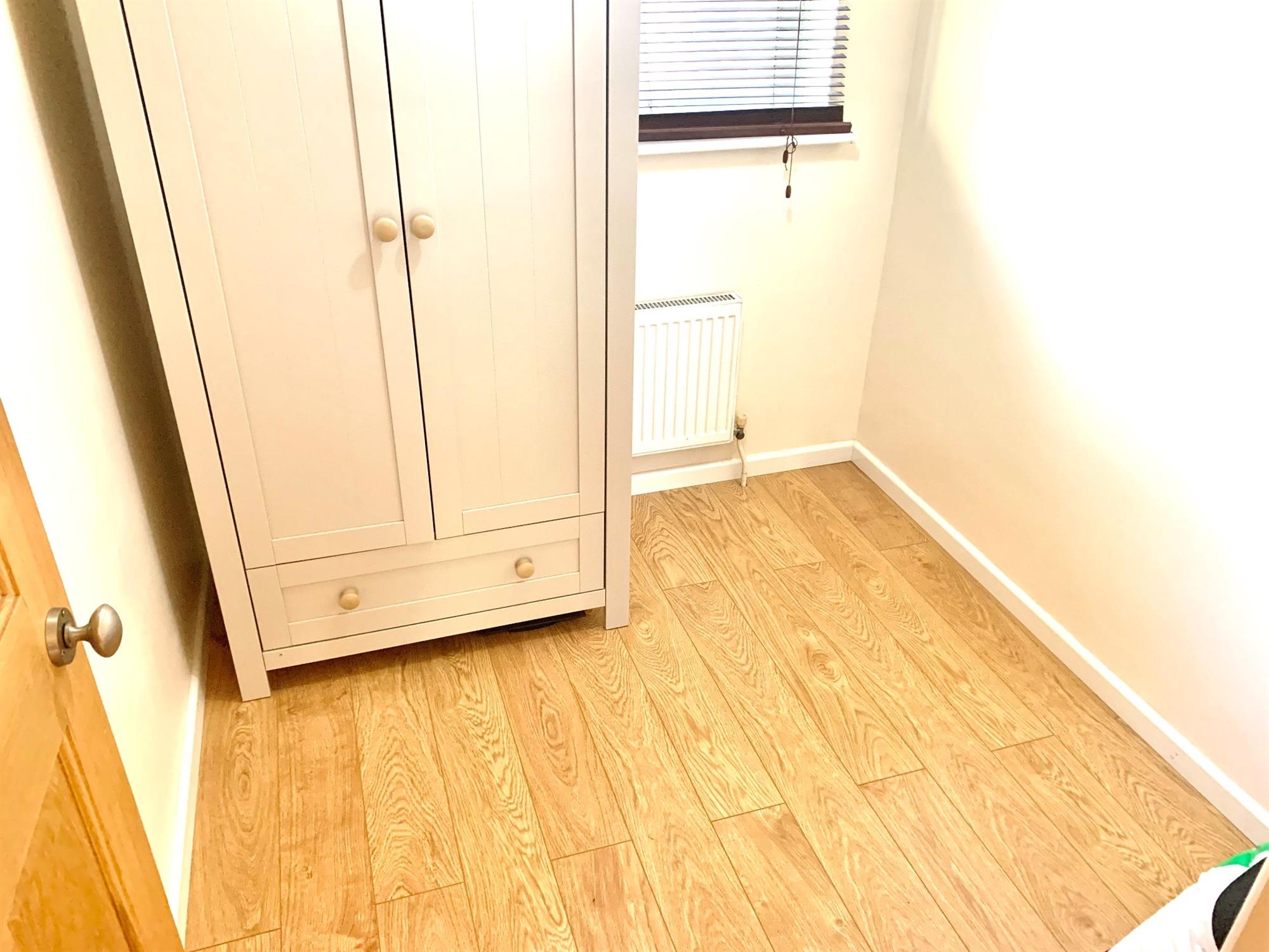 BEDROOM THREE – Single bedroom with laminate flooring, window to front and built in cupboard. Free standing wardrobe.