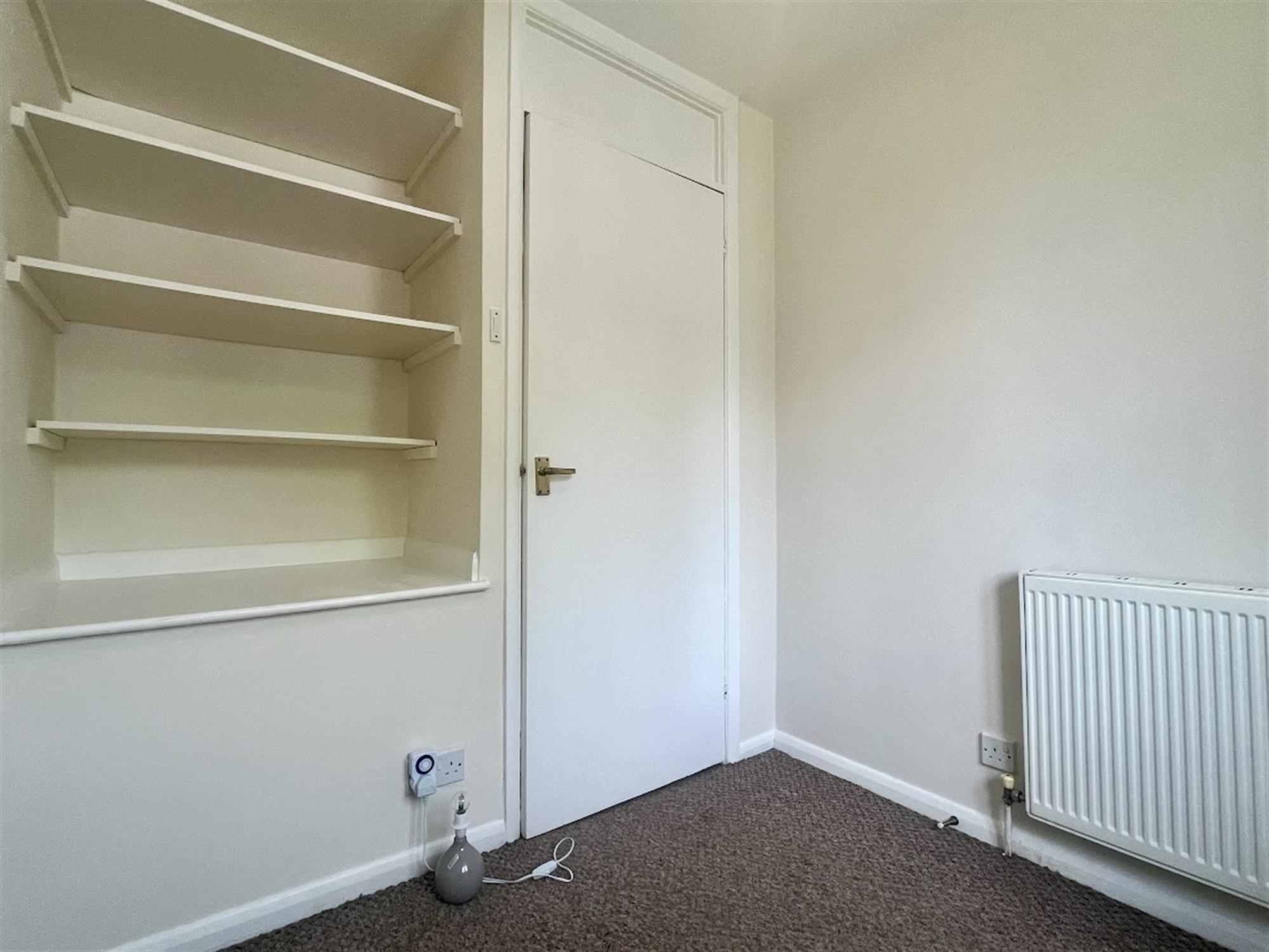 BEDROOM THREE – Single bedroom with carpet, window to front and built in shelves.