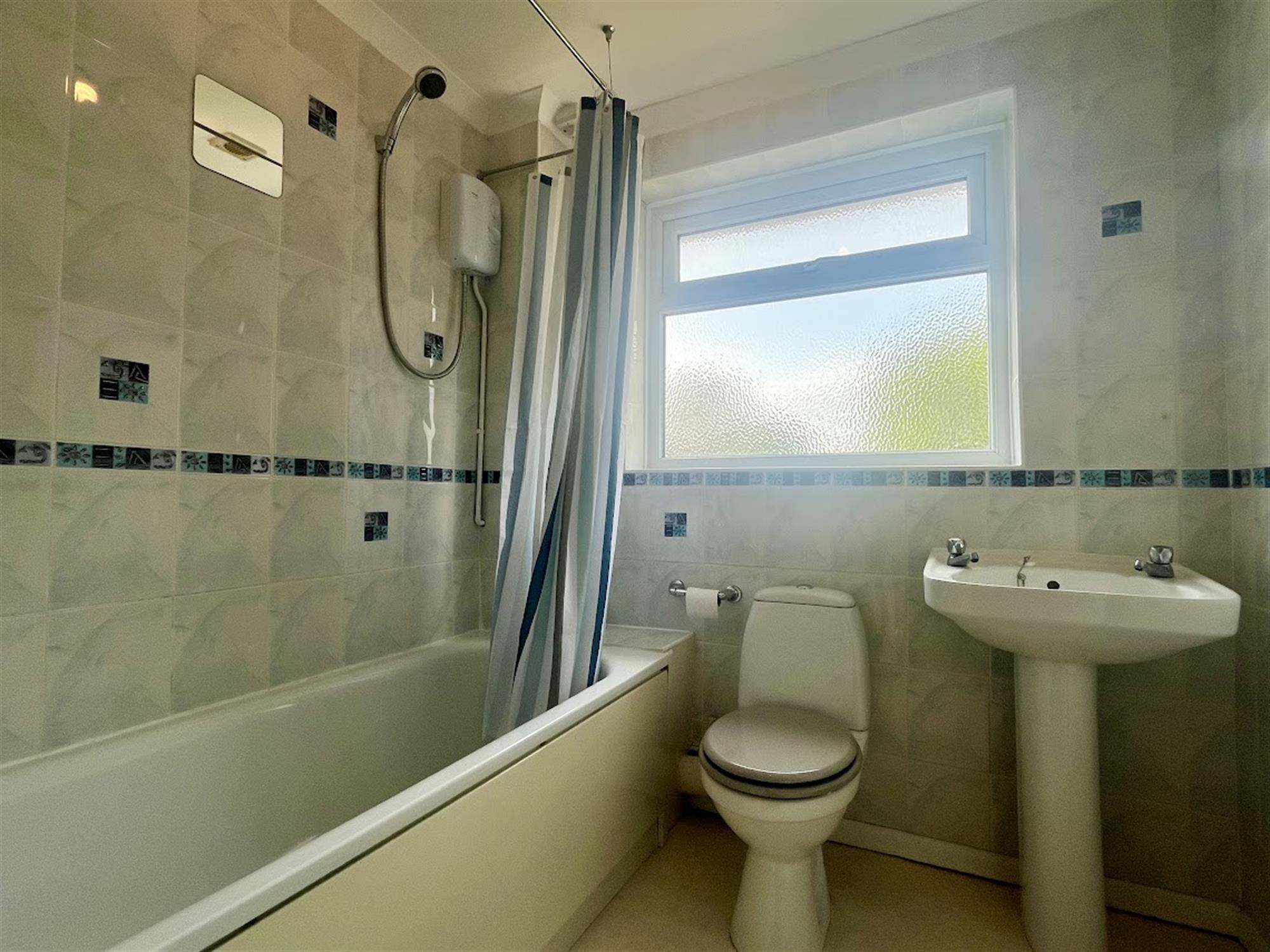 BATHROOM – White suite family bathroom with electric shower over the bath, sink and toilet. Window to rear.
