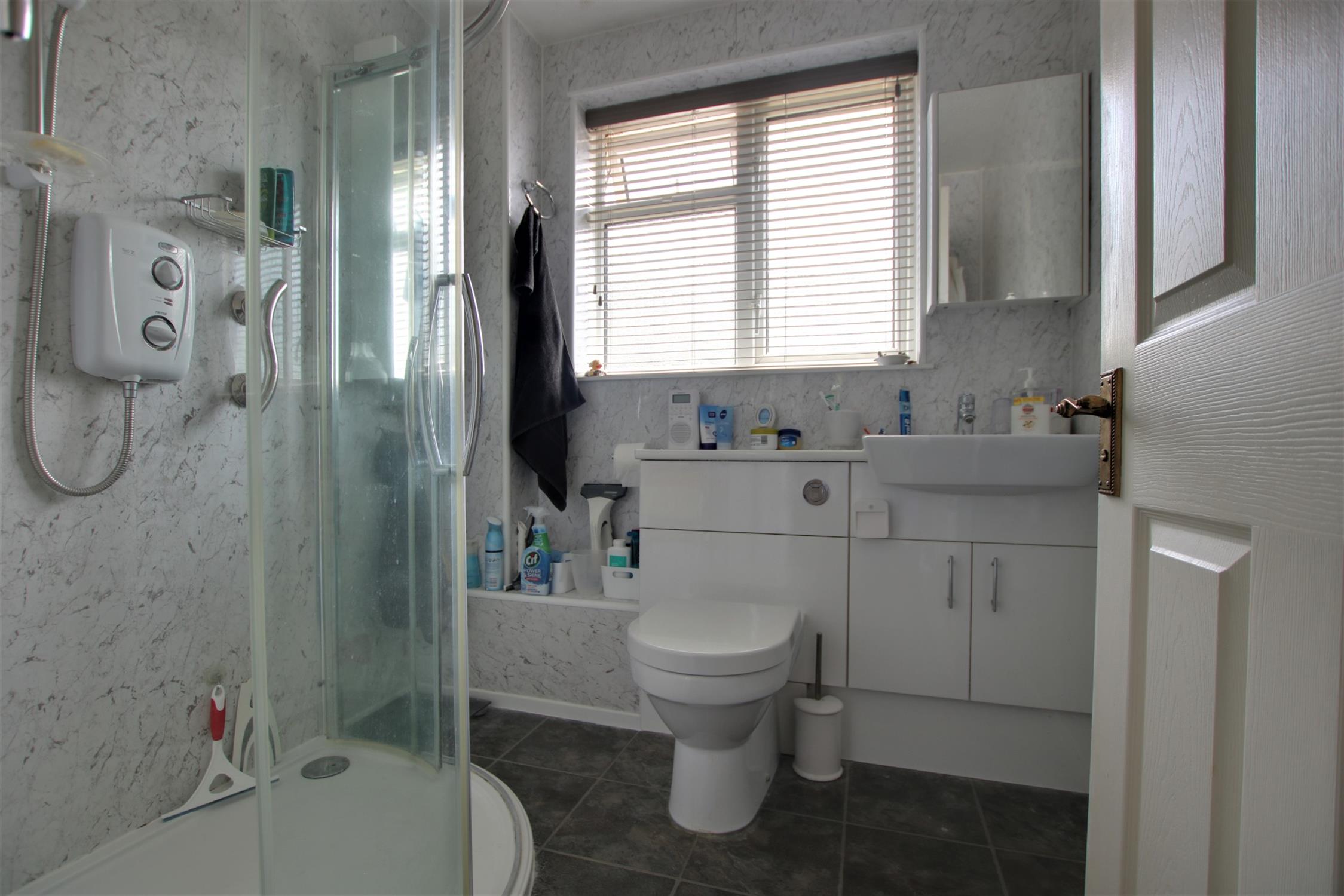 Vinyl tiled flooring. Marble effect wall panelling. Walk-in shower with glass sliding doors and electric shower unit, white gloss vanity unit with ceramic wash basin and w.c. with hidden cistern and storage. Textured ceiling. Obscure double glazed window to rear.