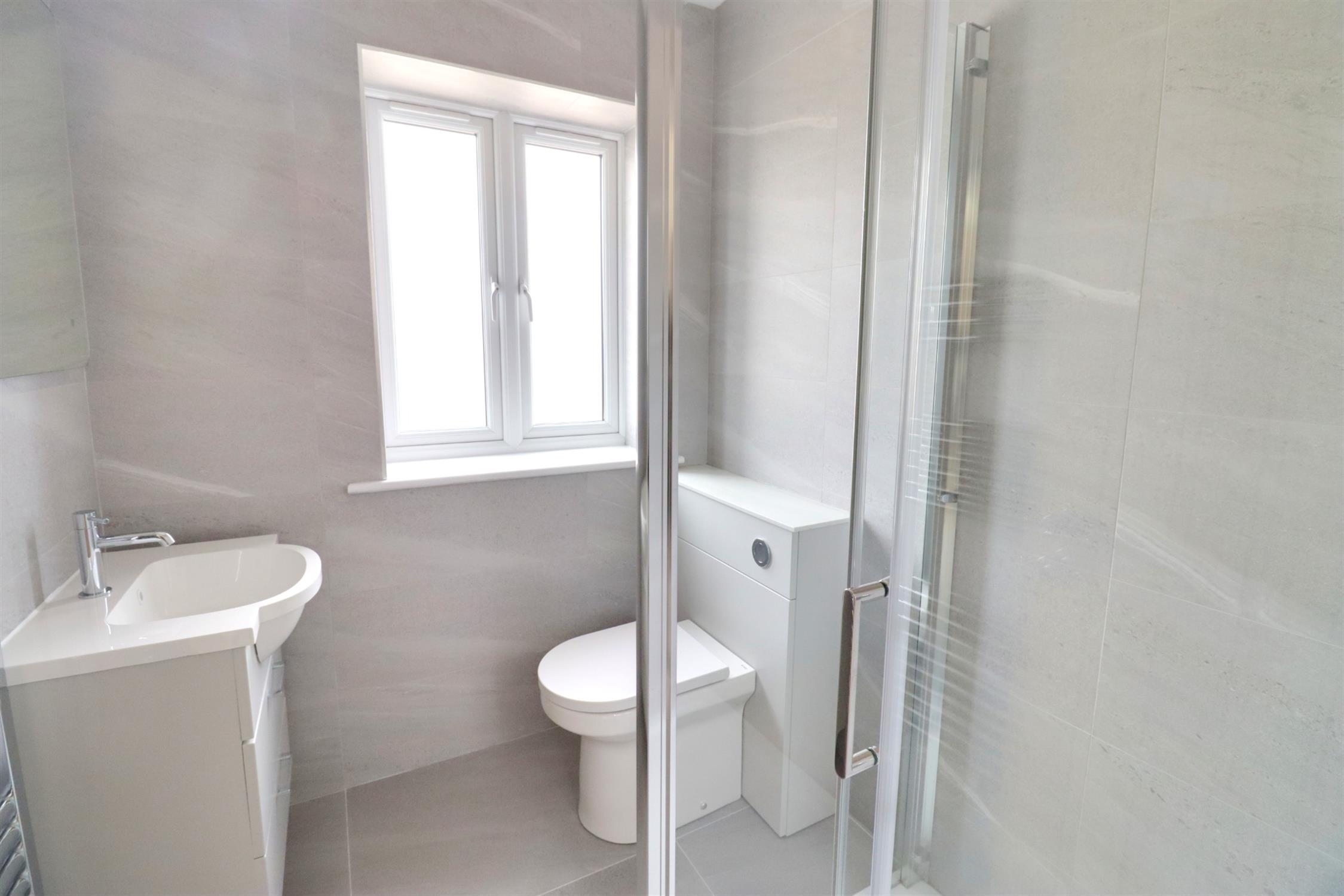 Concealed flush WC, radiator, concealed flush WC, vanity unit, front aspect double glazed obscured window, Karndean flooring, extractor fan.