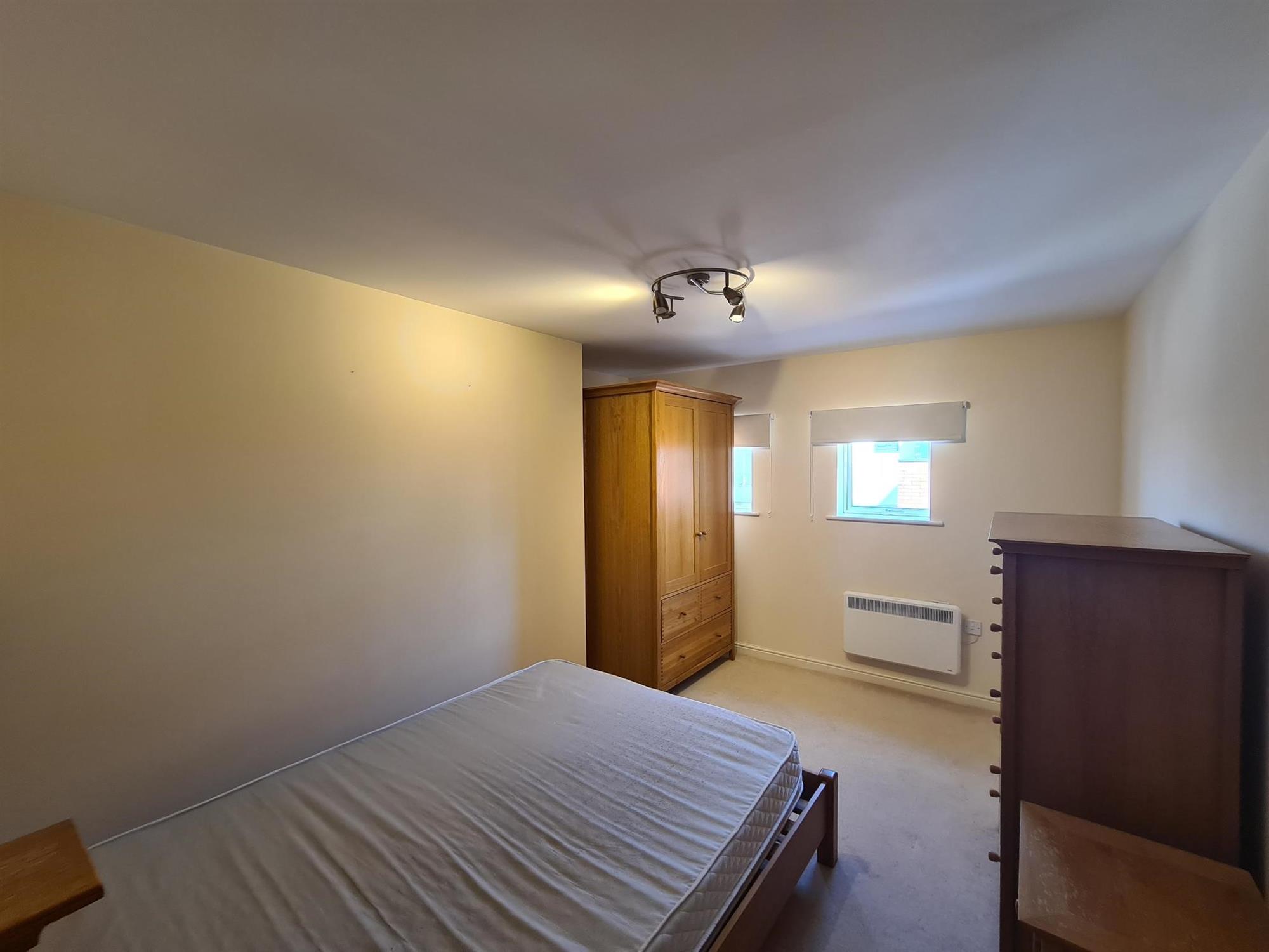A generously sized double bedroom with a window to the side, carpet flooring and a door to the en-suite shower room. Furnishings comprise: a double bed and mattress, a double wardrobe, a bedside unit, a chest of drawers and a small cupboard unit.