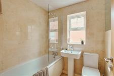 Fitted with a white suite incorporating a panelled bath with shower screeen and Mira shower over, pedestal basin and WC. Complimented with tiled walls and floor. Inset lighting. Double glazed window to the side aspect.