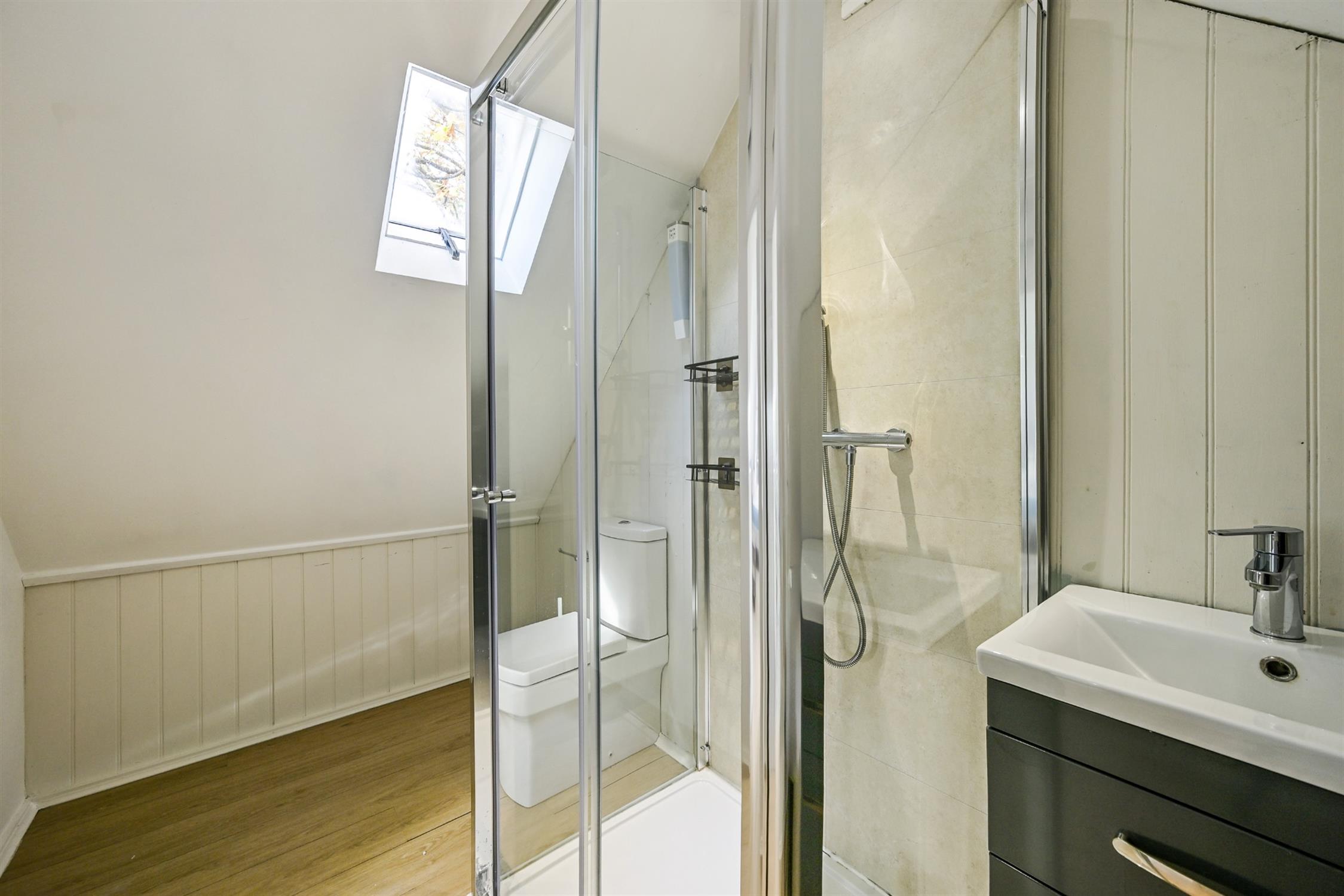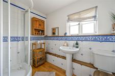 Fitted with a white suite, comprising tiled shower cubicle, pedestal wash hand basin, low level WC. Heated towel rail. Inset lighting. Window.