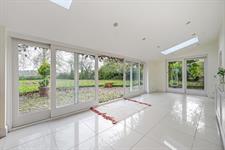 The sun room is a lovely light and spacious room with glazed windows and doors opening onto the garden terrace and the lawn beyond. Tiled floor. Radiator. Velux style windows. Inset lighting and glazed double doors opening into: