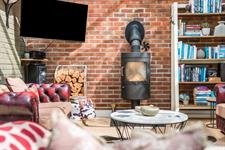 Featuring a fireplace with fitted wood burning stove, double glazed window enjoying a view over the garden. Fitted alcove shelving and log store. Double glazed double doors opening into: