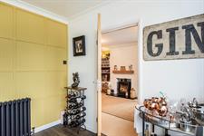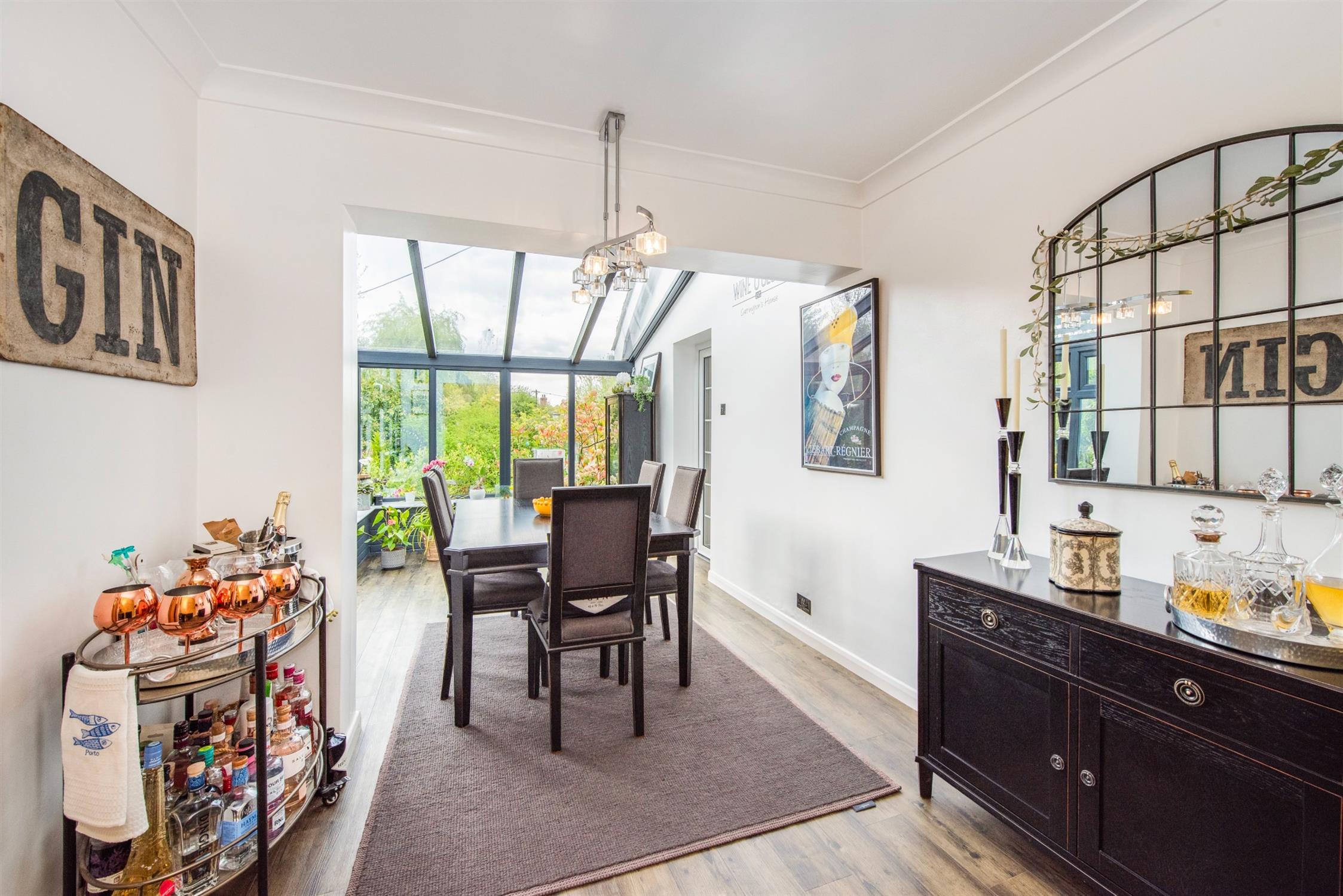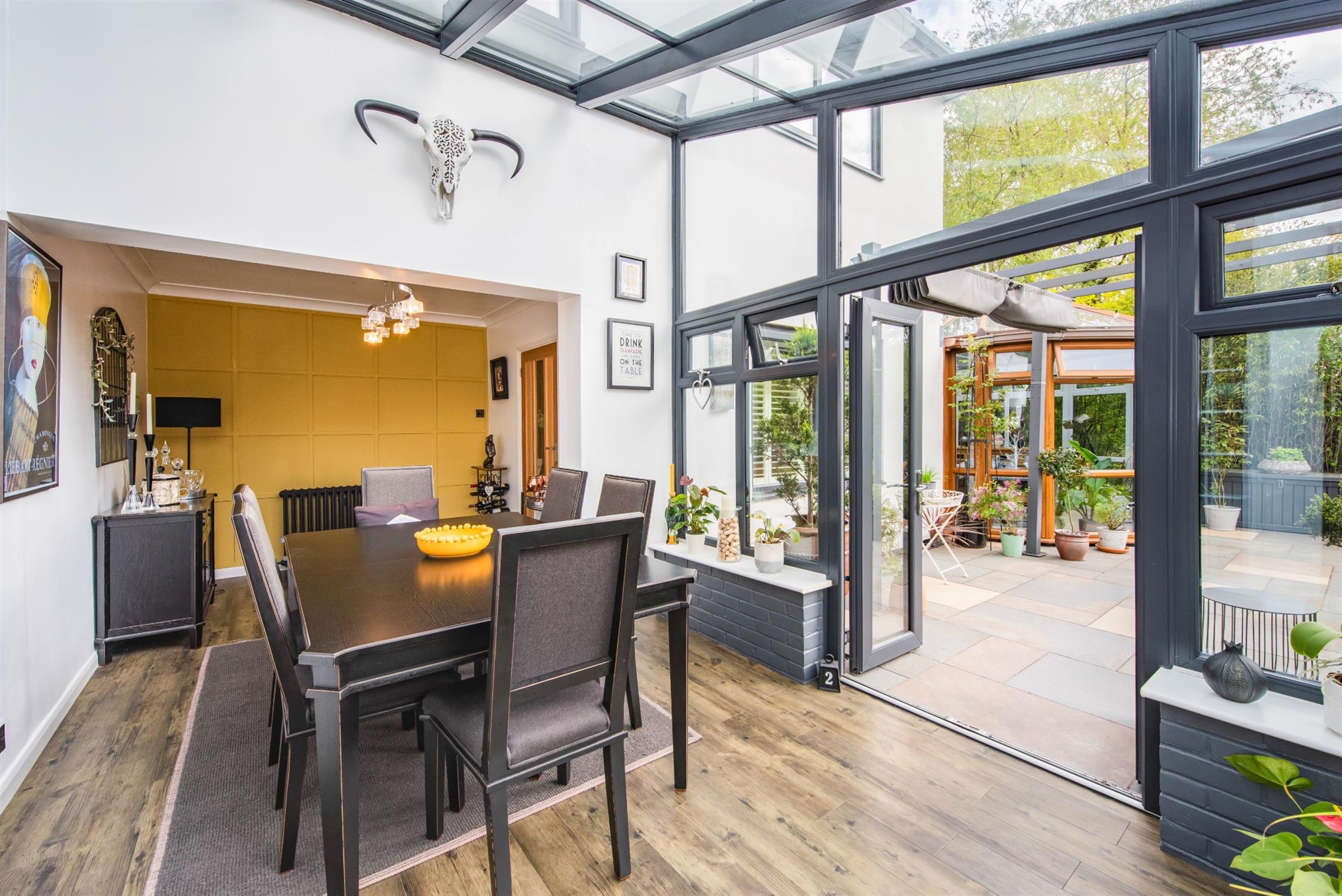 The dining room is extremely versatile impressively extended with a glazed roof and windows giving a perfect view over the gardens and double doors onto the connecting paved terrace. Period style radiator. Door to: