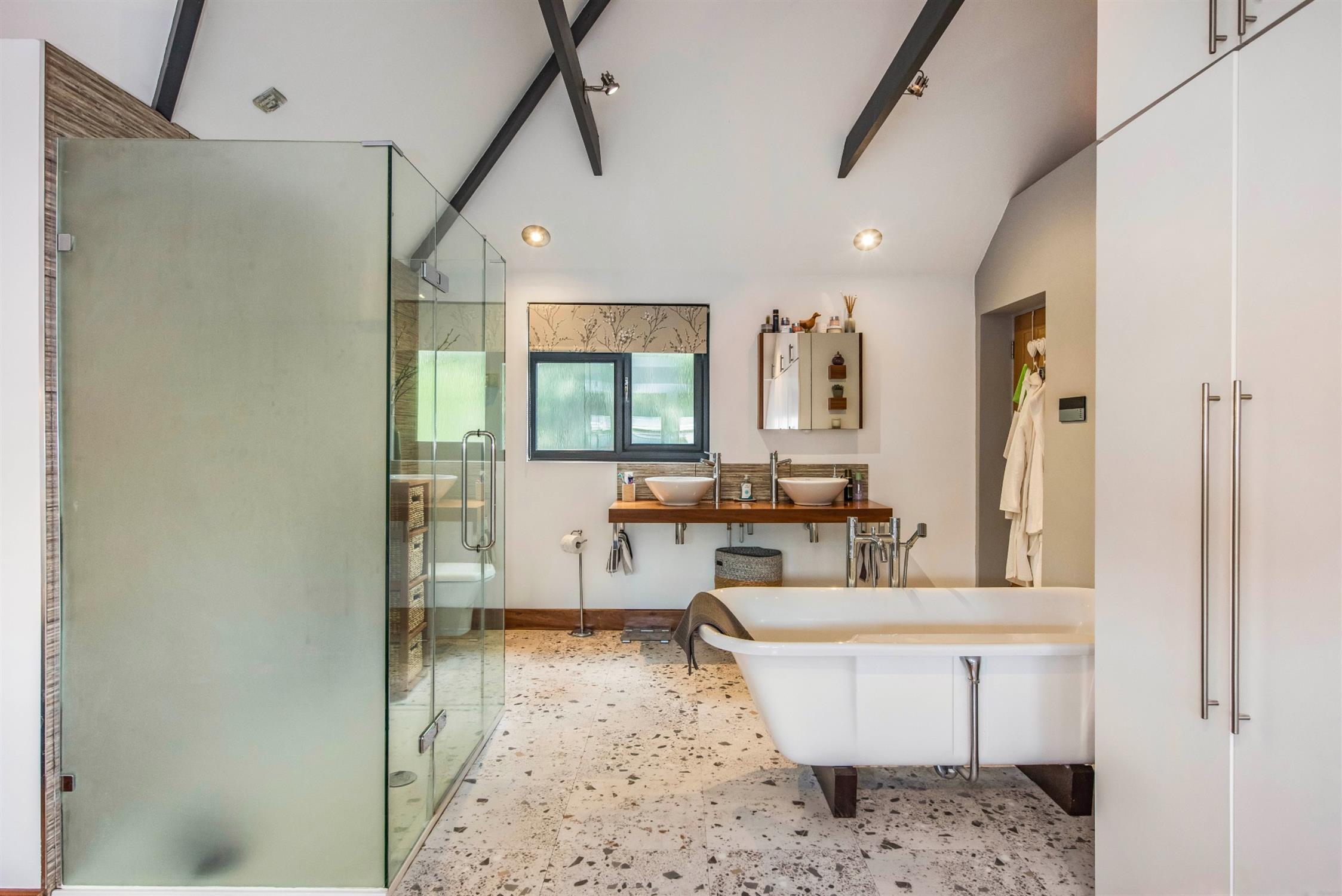 The bedroom suite has been stylishly designed as a fabulous open plan room which includes a superb open vaulted ceiling with inset lighting and underfloor heating. There are three Velux style windows to the front elevation and a double glazed window to the rear. A range of built in wardrobes are fitted to one wall, along with useful eaves storage space. The luxurious and high specification en-suite is fitted with a large walk in shower, a freestanding bath, twin fitted wash hand basins and a WC.