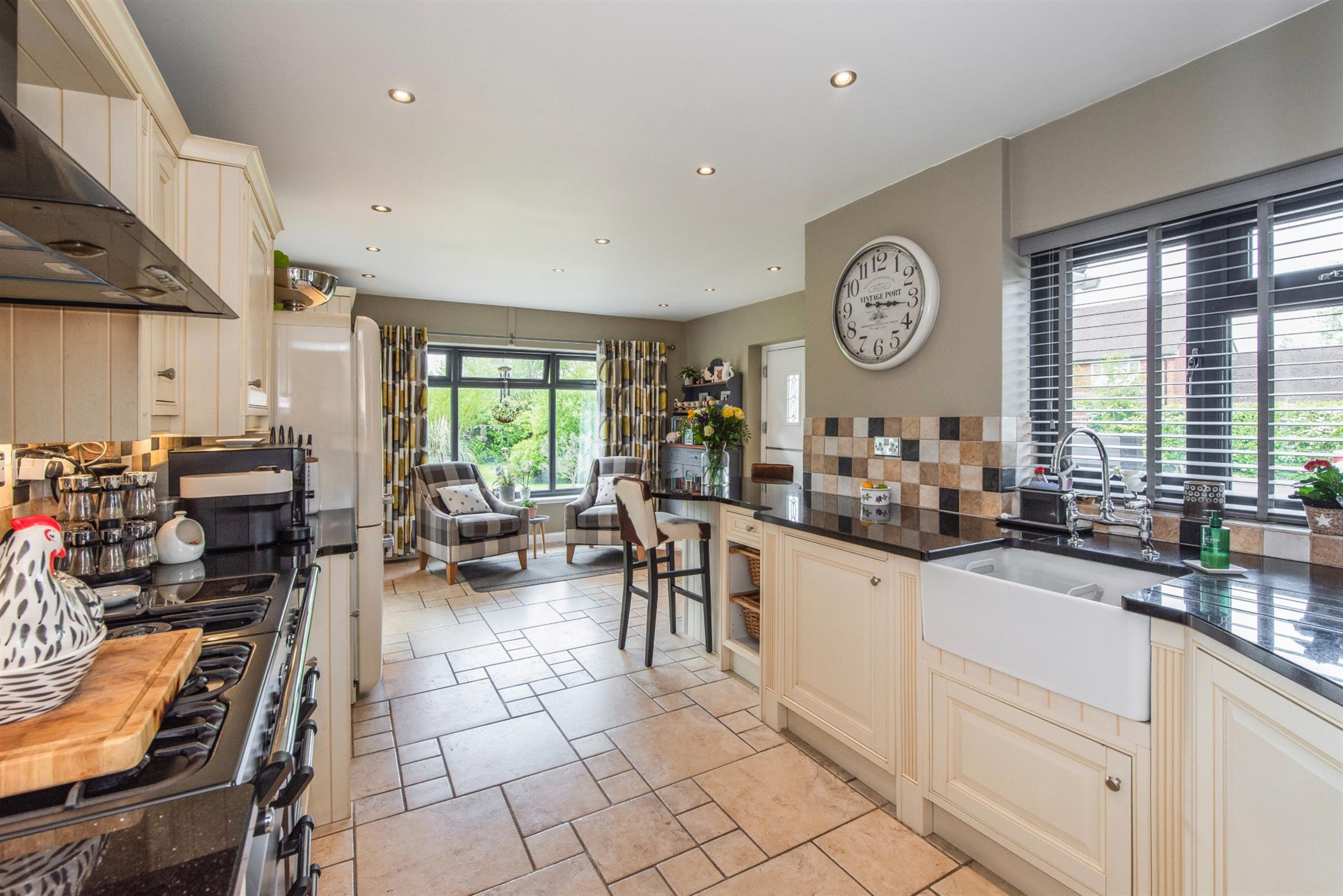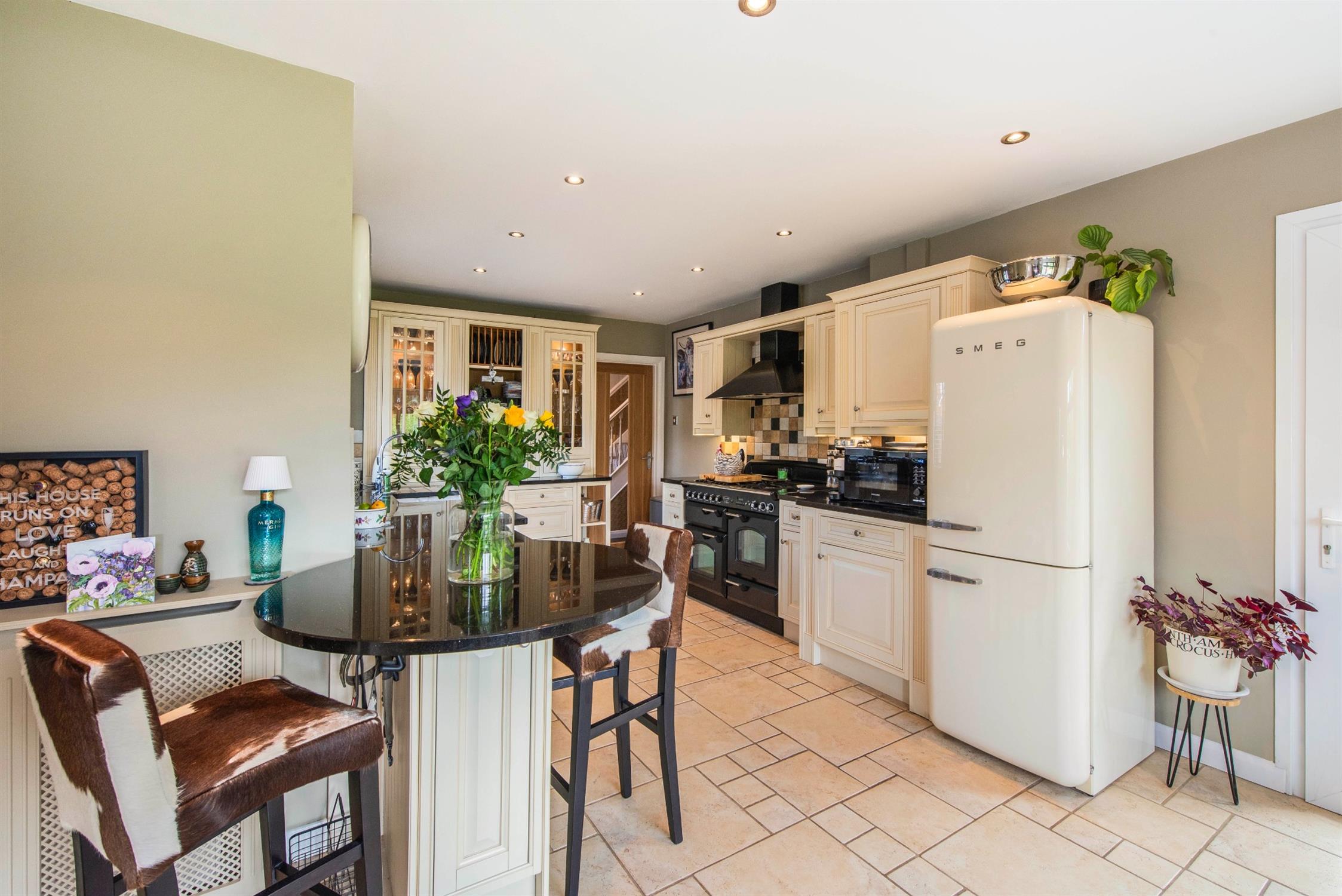 Impressively fitted with a comprehensive range of base cupboard and wall units which are complemented with granite worksurfaces and a breakfast bar. A butler style sink with mixer tap over. Intregrated dishwasher, appliance spaces for a range style cooker and fridge/freezer. Extractor hood. Tiled floor. Underfloor heating. Double glazed window to the front aspect and double glazed window overlooking the rear garden. Radiator with cover. Inset ceiling lighting. Stable style door opening onto the front driveway. Door to the entrance hall and door to:
