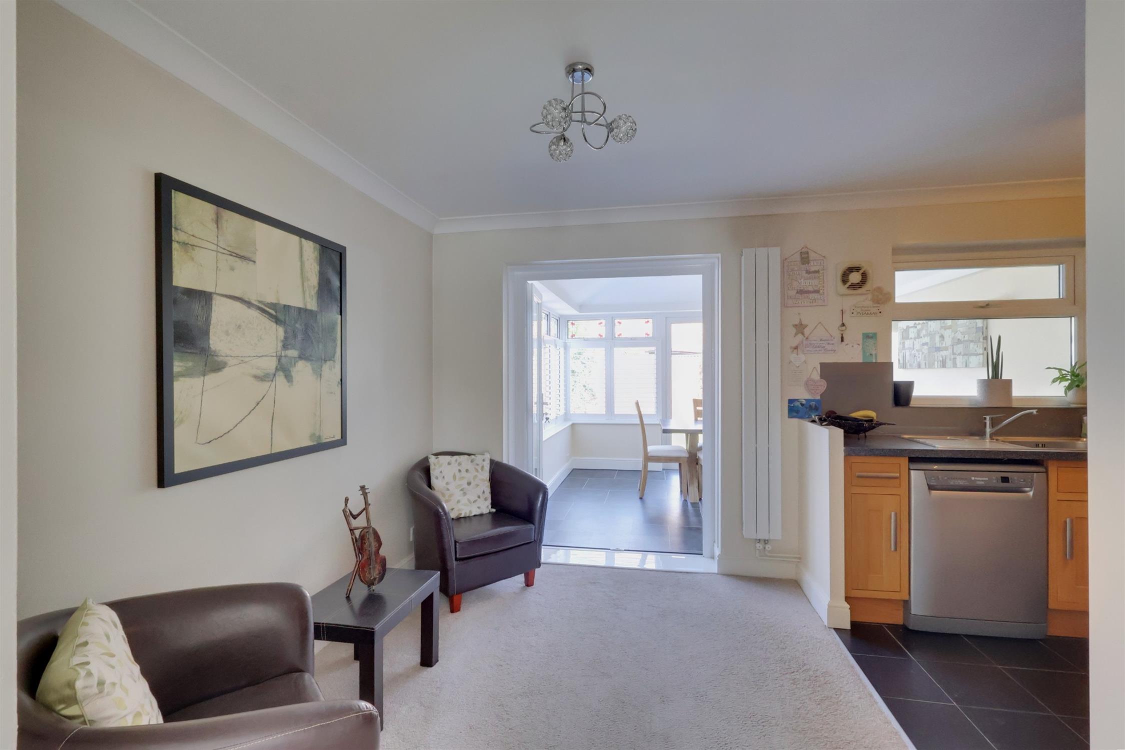 Smooth plastered coved ceiling, vertical wall mounted radiator, open into kitchen area.