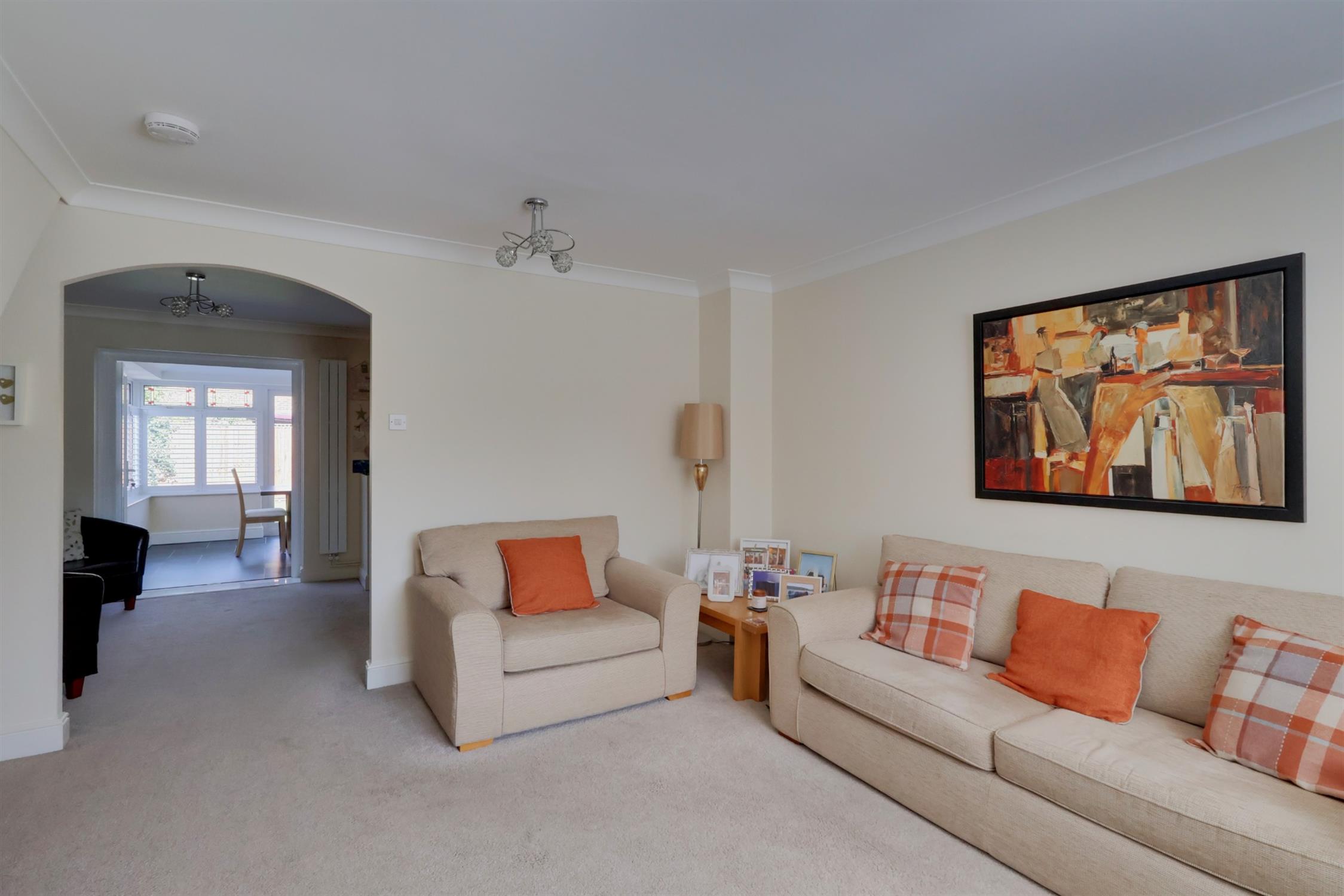 Smooth plastered coved ceiling UPVC window to front aspect with fitted shutters, radiator, under stairs alcove, various power points and opening to dining room.