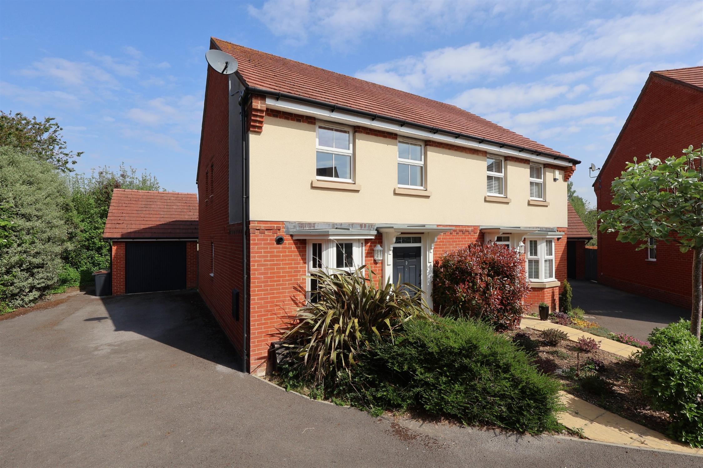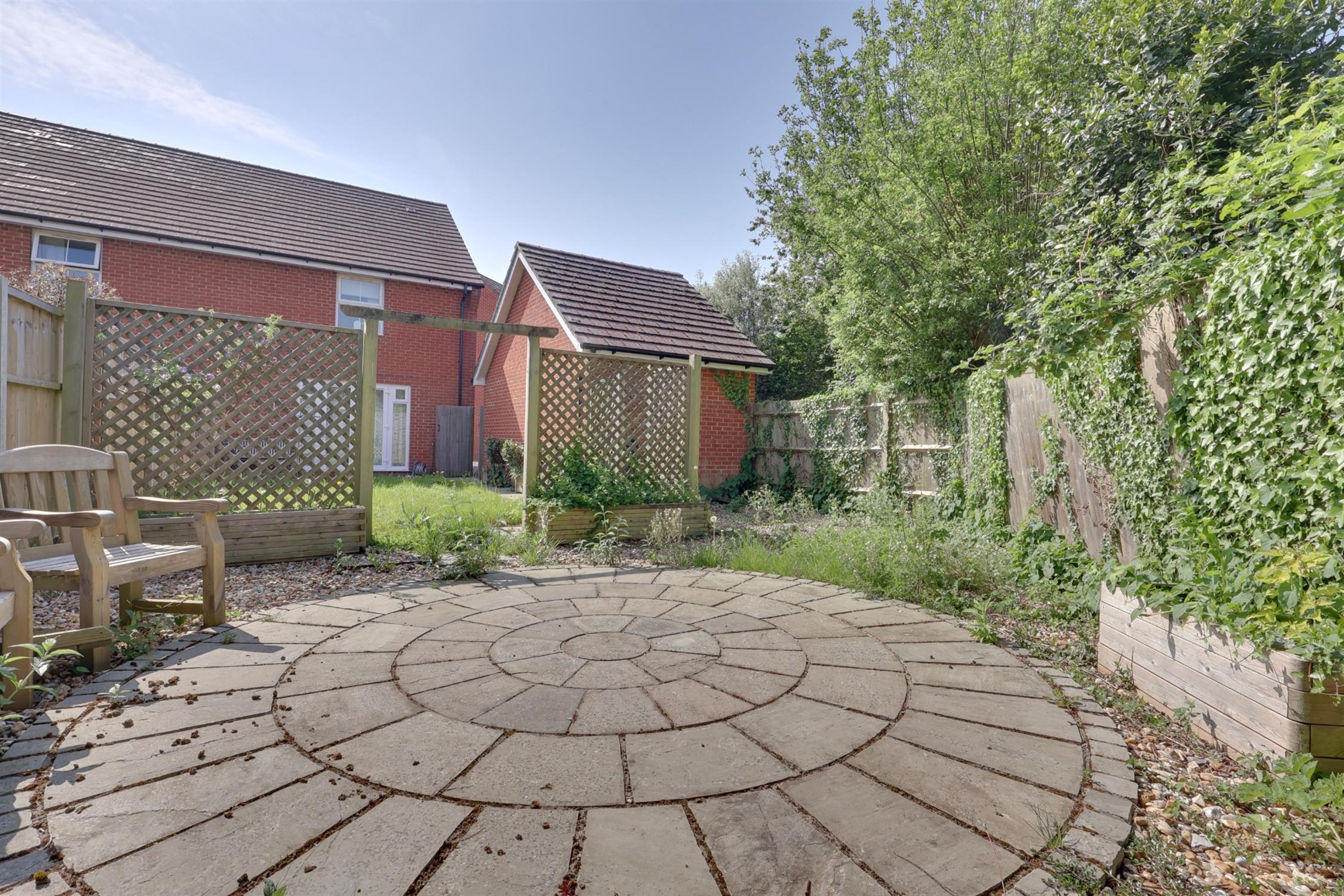 The rear garden is enclosed with fencing, mainly laid to lawn and patio and benefits from side access. To the front, the property features mature shrubs and borders with a pathway to the entrance. A driveway provides off-road parking for two vehicles and leads to a detached garage with a metal up-and-over door.