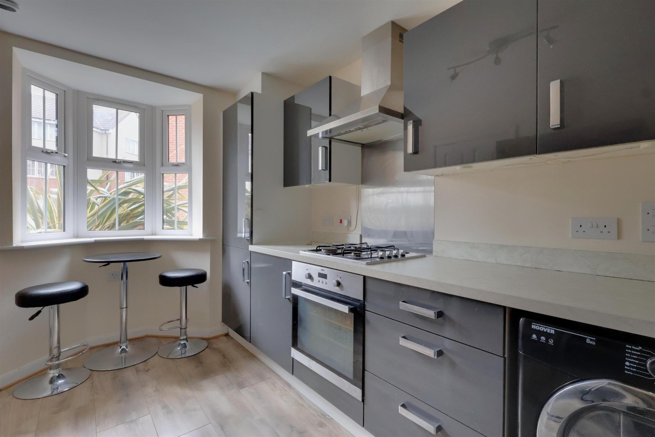 Positioned at the front of the property and features a double-glazed bay window, a range of wall and base units with hard-top work surfaces, a stainless steel sink with mixer tap, and space for a washing machine, tumble dryer, and fridge-freezer. Integrated appliances include a gas hob with extractor hood and an oven beneath. Radiator.