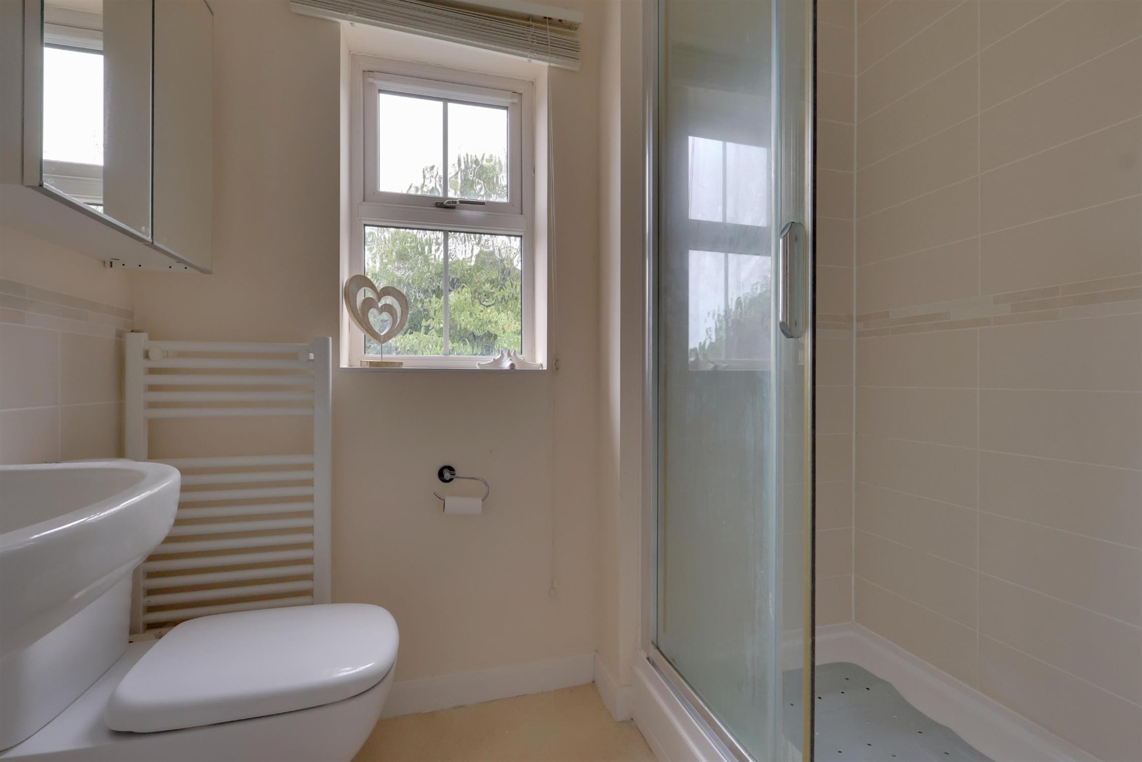 Comprises a shower cubicle, low-level WC, pedestal wash hand basin, part-tiled walls, and an obscured double-glazed window to the front.