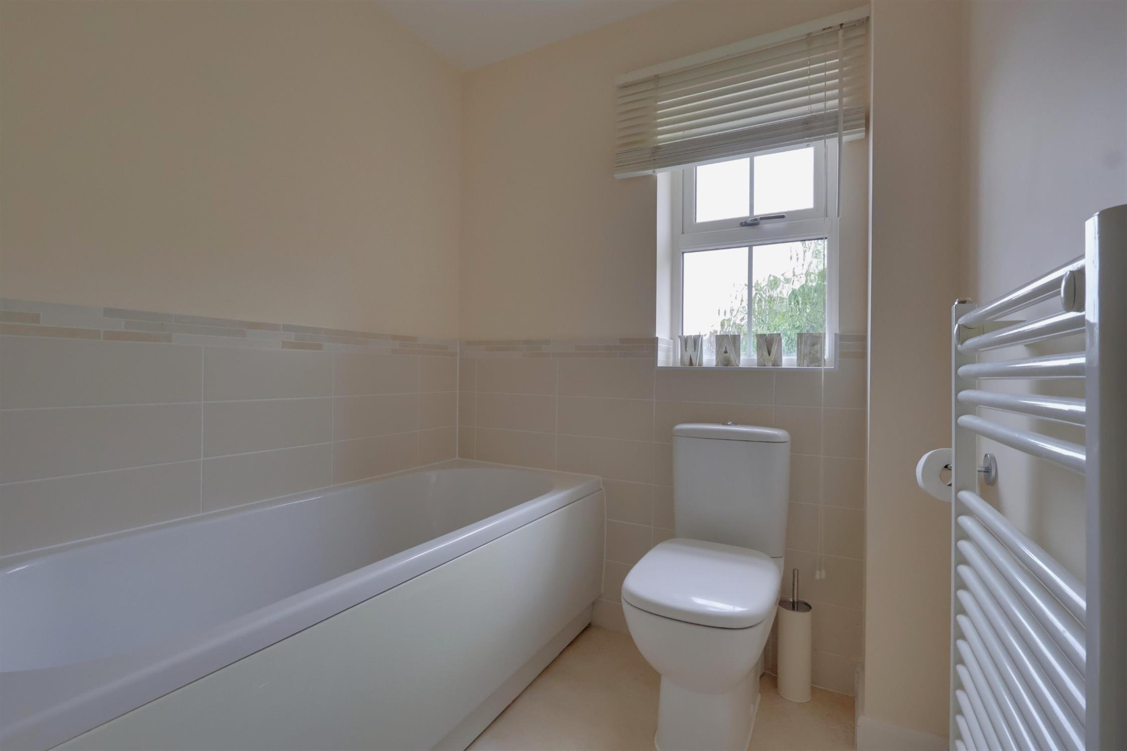 Three-piece suite, including a panelled bath, low-level WC, and pedestal wash hand basin. Additional features include part-tiled walls, a ladder-style radiator, and an obscured double-glazed window to the front.