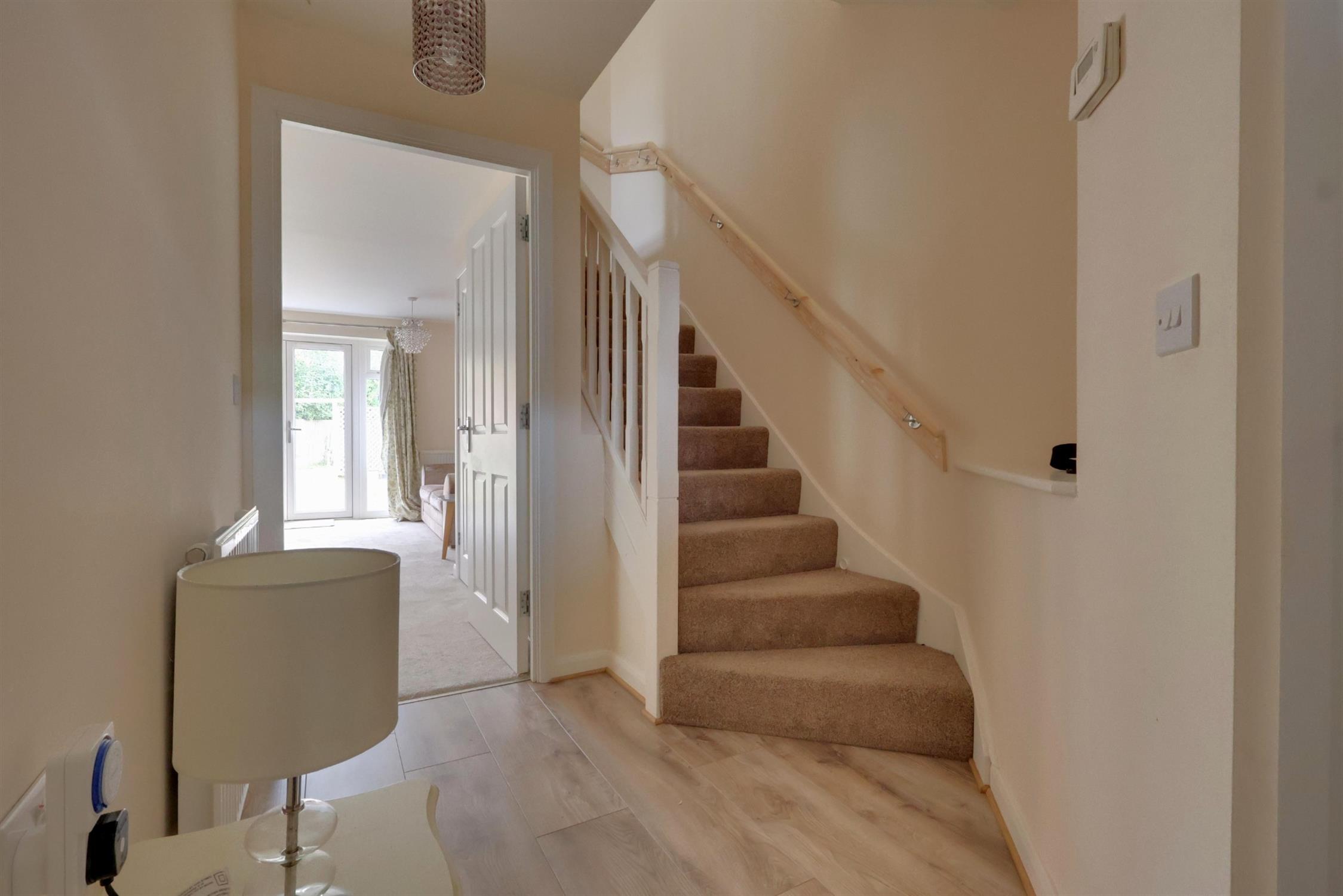 Entrance via the front door leads into a welcoming hallway with doors to all ground floor rooms, a radiator, and stairs rising to the first floor.
