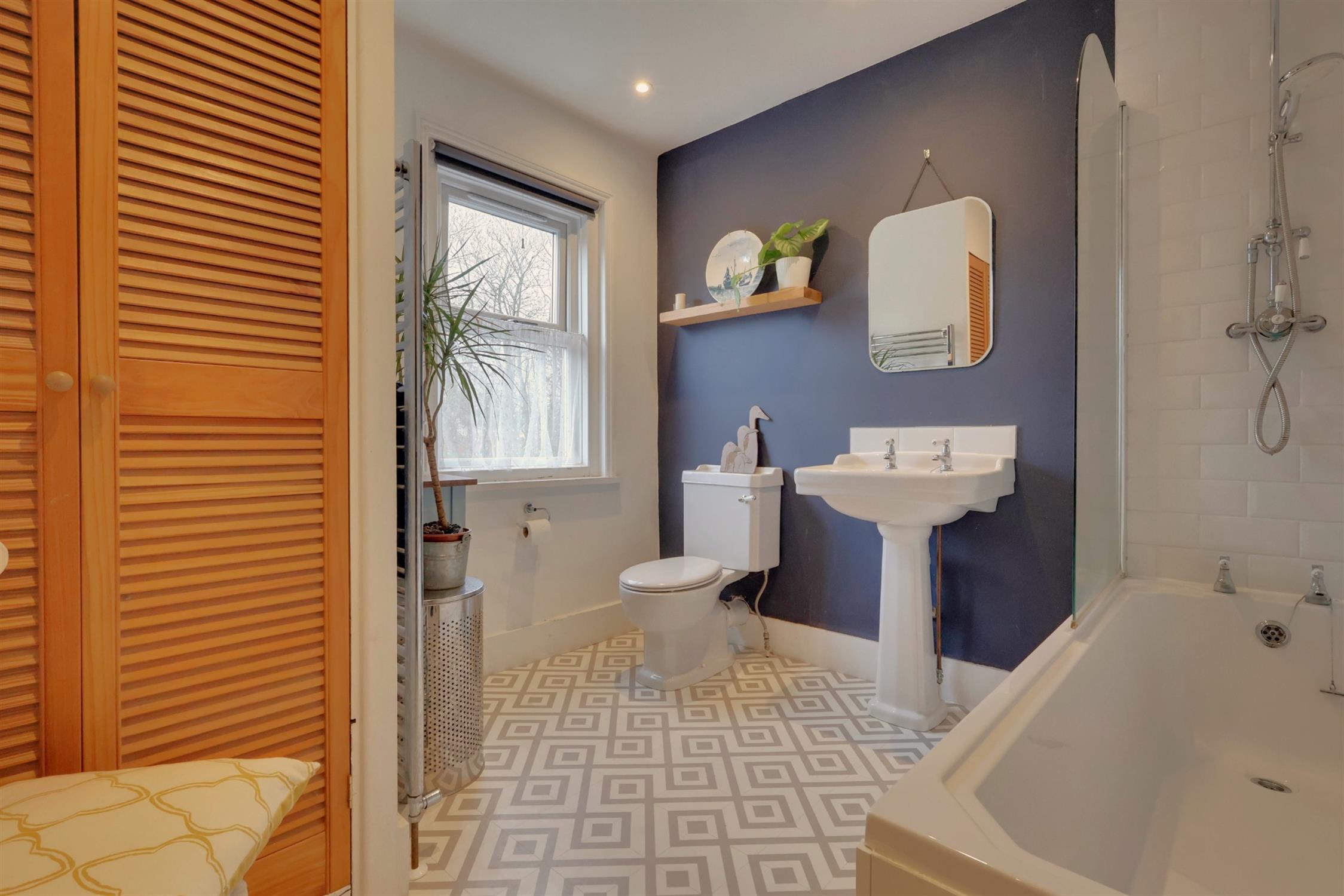 Panelled bath with screen and shower attachment. WC. Ceramic sink. Heated towel rail. Airing cupboard. Double glazed window.