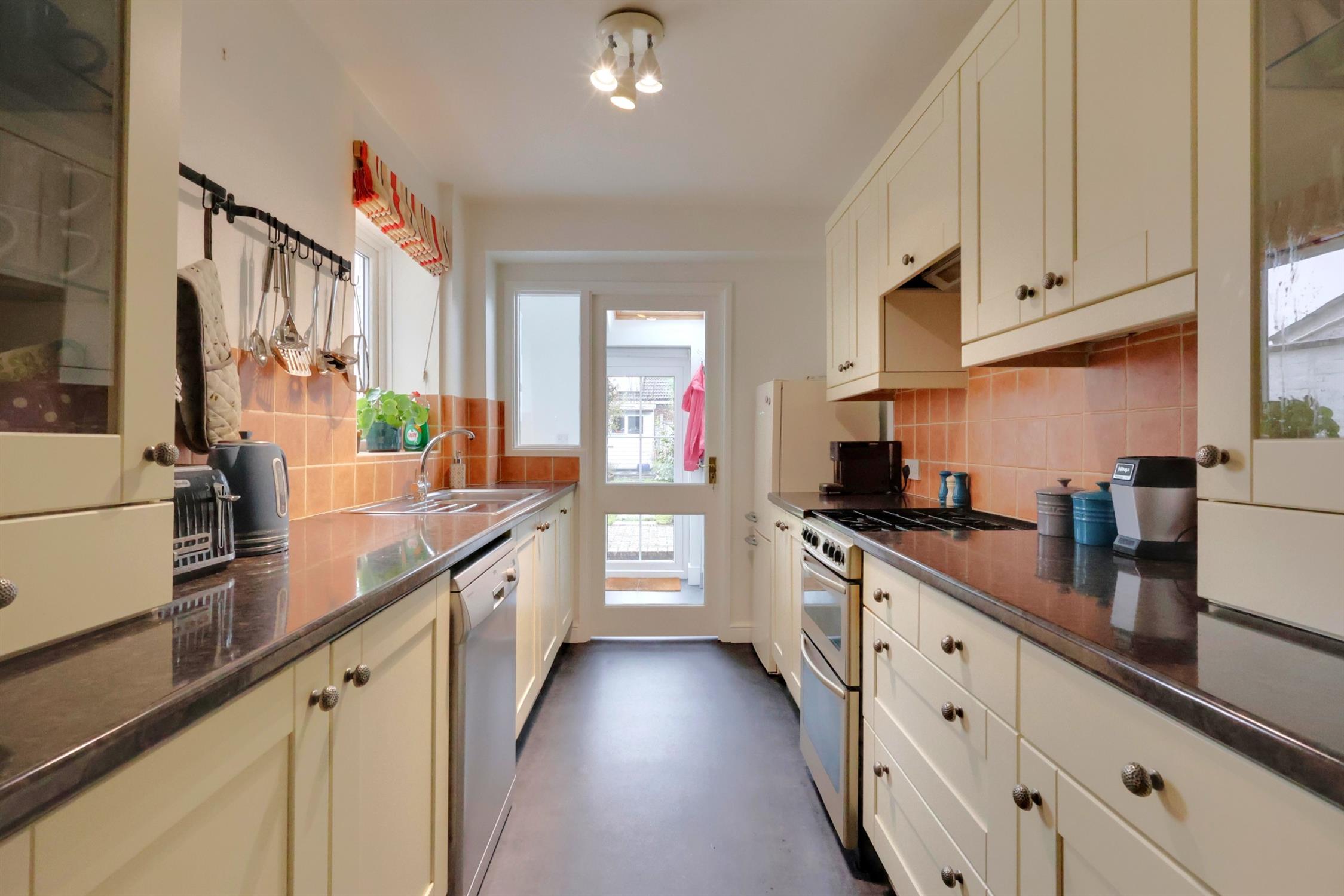 Work surface. Plumbing for washing machine. Radiator. Extractor fan. Door to rear garden.
